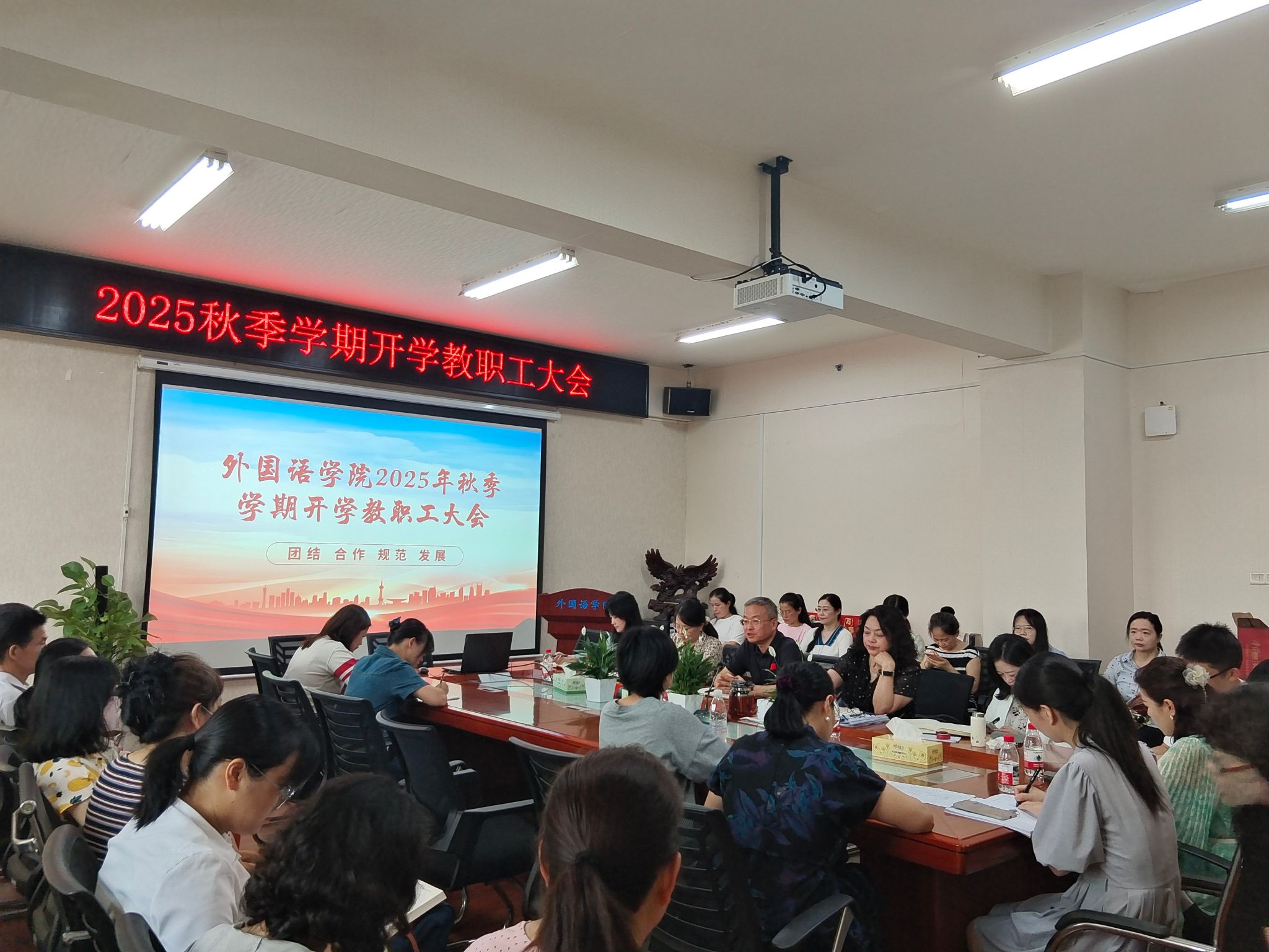 8月29日上午,外国语学院在办公楼315-1会议室召开2025年秋季学期开学教职工大会,全体教职工参加。副校长刘钟理出席会议并讲话。