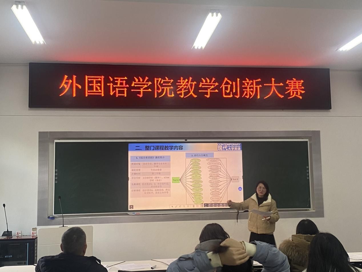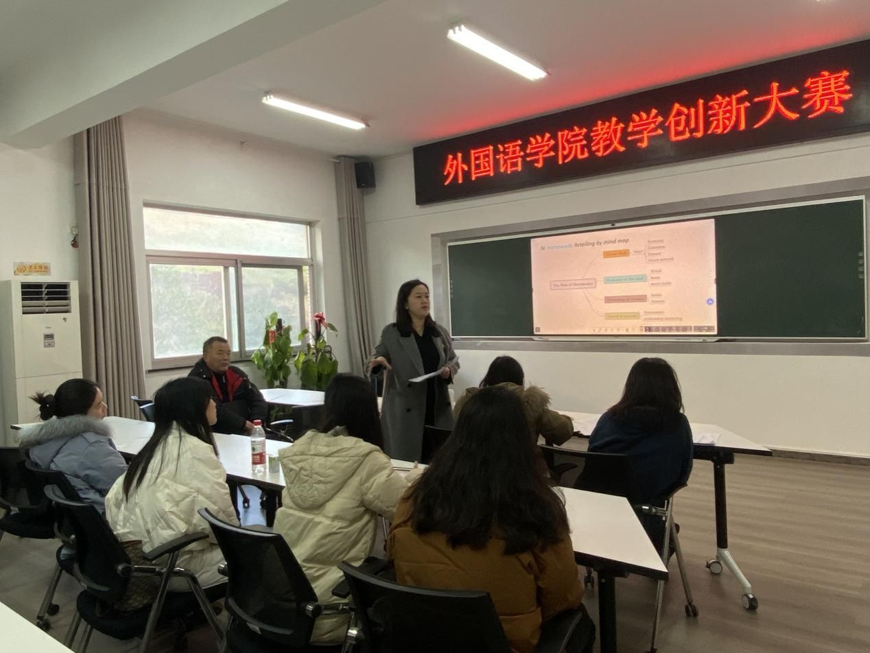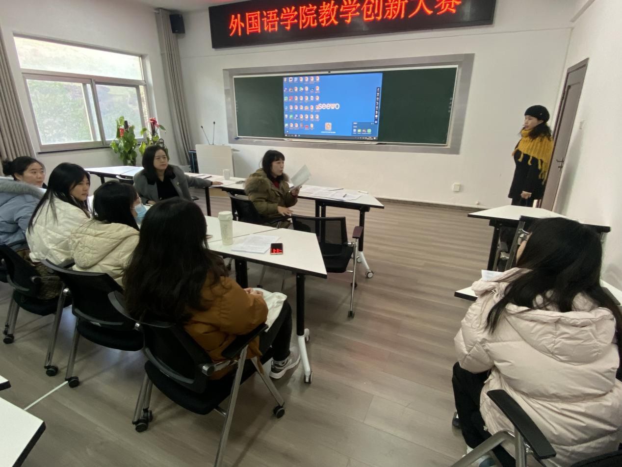 (本网讯)为鼓励和推动教师进行教学创新,提升教学质量,12月25日下午外国语学院在办公楼317举办教学创新大赛。共有5支教师团队参加比赛,外国语学院副院长李曦主持比赛。