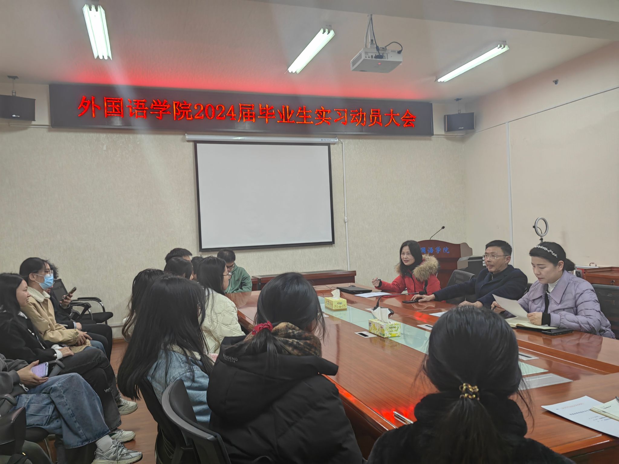 (本网讯)3月4日下午,外国语学院在办公楼315会议室开展了2024年毕业生实习动员大会。学院党委书记蒋勇威、副书记张鹏、副院长黄越、教科办主任殷琛,以及报名参加学院集中实习的毕业生参加了会议。会议由副院长黄越主持。