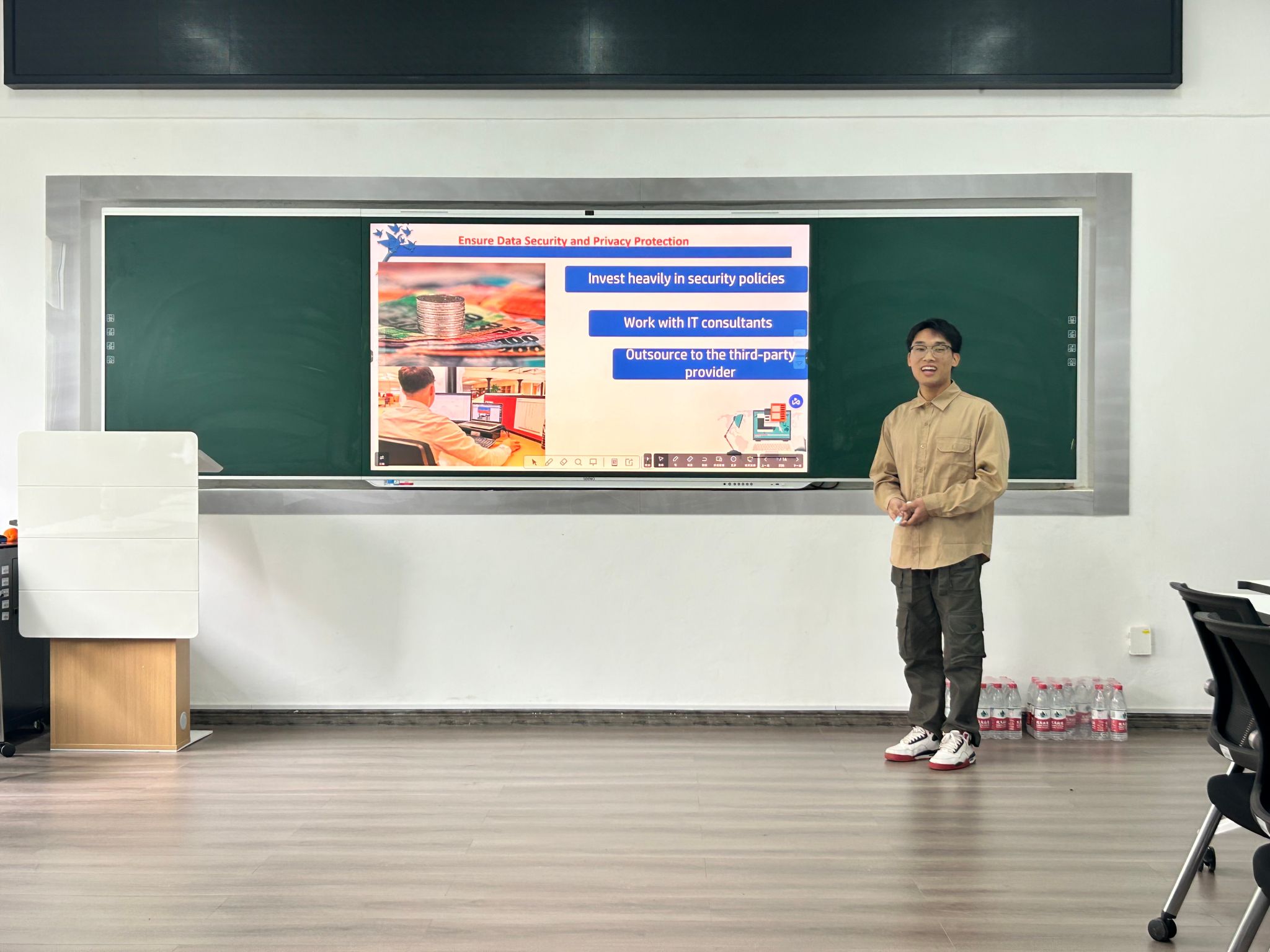 本次校赛共分为平台知识竞赛+主题演讲比赛两个阶段,同学们表现出了极高的学习热情和专业精神。平台知识竞赛采用个人赛方式进行,参赛选手在竞赛平台参与限时答题,考题设计国际商务综合知识和实务操作。在主题演讲环节,各参赛队伍更是各展其能,他们不仅在演讲内容上进行了挖掘和创新,而且在演讲的形式和表现上也下足了功夫。选手们表现出色,英语表达流畅自如,逻辑条理清晰,对问题的分析深入透彻,提出的解决方案既富有创新又切实可行。他们的表现充分彰显了学生们卓越的创新思维能力以及扎实的英语语言应用能力,为观众和评委们留下了深刻的印象。