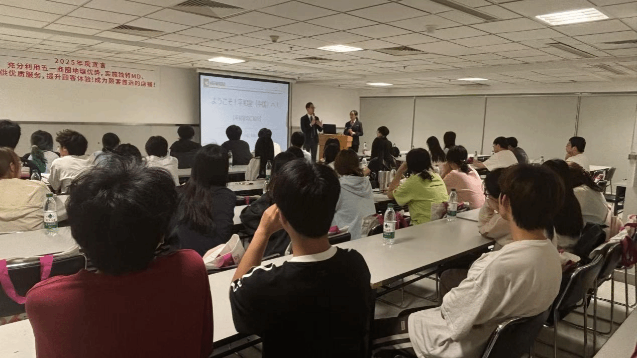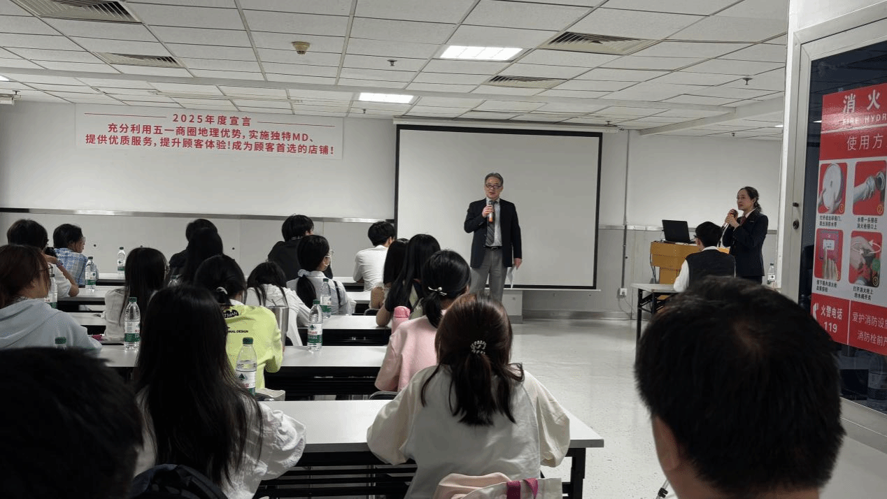 师生一行抵达后,得到了长沙永旺梦乐城总经理菅原基治先生与工作人员的热情迎接。接着,同学们步入了宽敞明亮的会议大厅。总经理菅原先生用日语致辞,对老师同学们的到来表示热烈欢迎,并表达了对校企合作交流的期待。随后,菅原先生通过精心准备的PPT展示,详细介绍了永旺梦乐城在中国的事业布局,包括湖南省的开店计划以及1号店、2号店的具体情况等。从商业设施的规划建设到运营管理,从服务标准到企业文化,全方位介绍让同学们眼界大开。