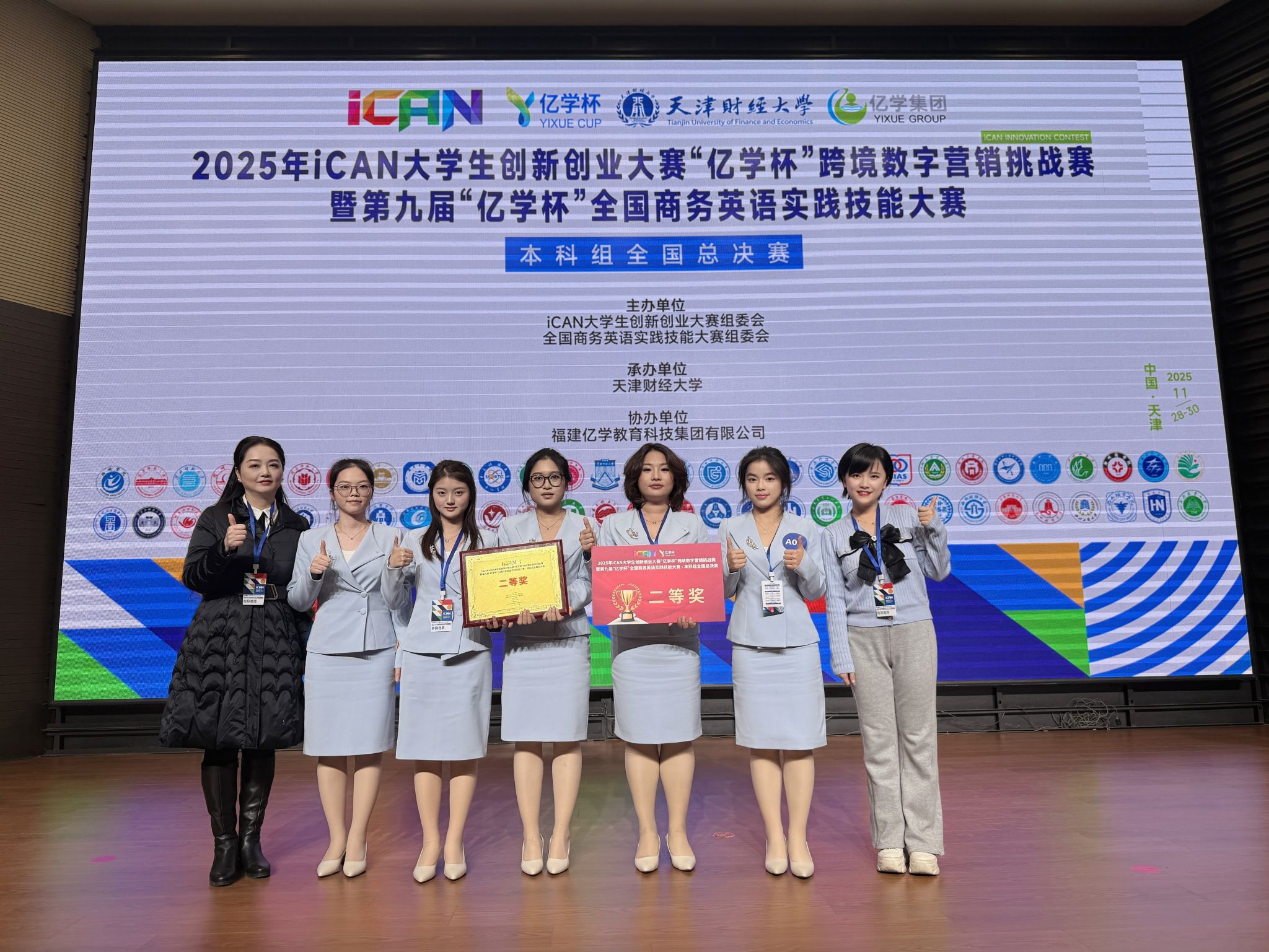 (本网讯)11月28日-29日,2025年iCAN大学生创新创业大赛“亿学杯”跨境数字营销挑战赛全国总决赛暨第九届“亿学杯”全国商务英语实践技能大赛总决赛在天津财经大学圆满落幕。WilliamHill官网外国语学院代表队历经多轮比拼,在全国高校队伍的激烈竞争中脱颖而出,最终斩获全国总决赛二等奖,充分展现了WilliamHill官网学子扎实的跨学科综合实践能力与国际化商务素养。此次参赛团队由外国语学院邱高、法小鹰老师联合指导。