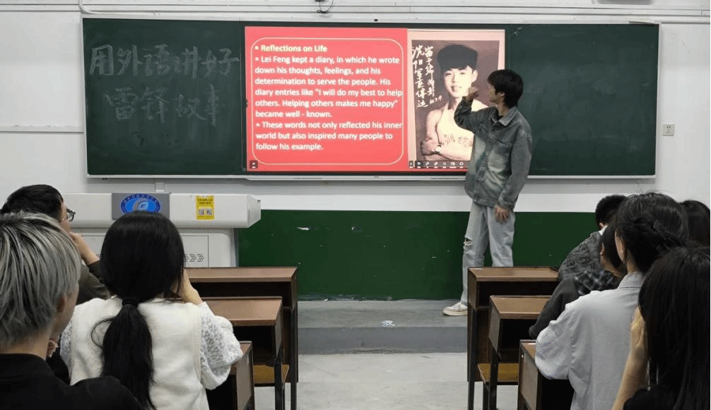 活动现场氛围热烈非凡,演讲者们凭借流利的外语技巧,深情讲述了雷锋同志用自己微薄的积蓄捐款助人、义务为乘客指引道路等感人至深的故事。他们不仅生动再现了雷锋的感人事迹,更将雷锋精神与现实生活紧密结合,深入探讨了在当代社会中传承与践行雷锋精神的具体路径,积极倡导同学们在日常生活中多行善举,踊跃参与志愿服务活动。