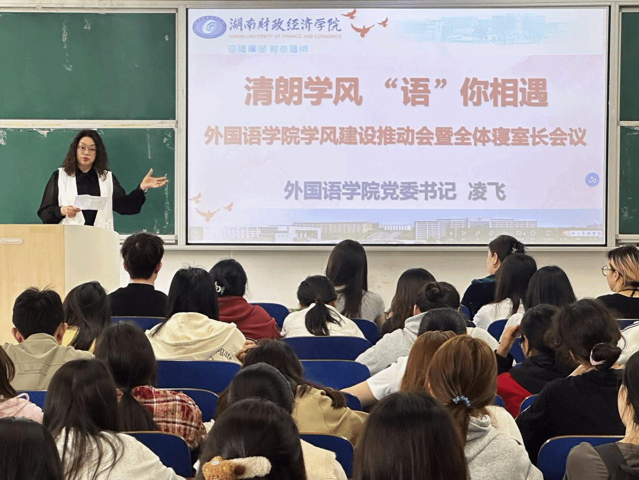 为加强学风建设,规范大学生日常行为管理,切实发挥寝室长在学生管理工作中的纽带作用,4月22日12点30分,外国语学院在主校区3110教室召开学风建设暨寝室长会议。外国语学院党委书记凌飞、党委副书记张鹏、学工办主任肖叶枝、辅导员胡文志、谭霞以及各年级全体寝室长参加会议。会议由肖叶枝主持。