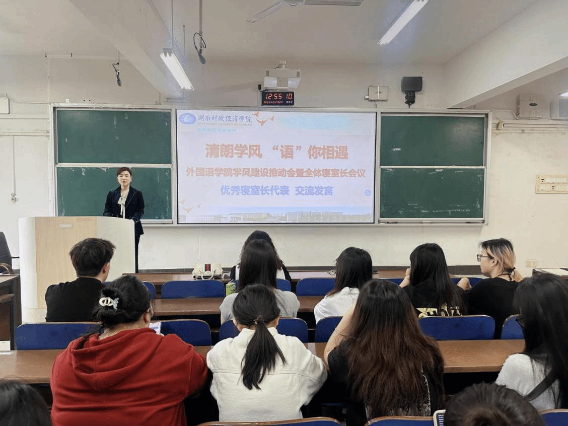 随后,来自22级商务英语一班的优秀寝室长代表龚雨鑫进行了经验分享。她表示,作为寝室长要以身作则,在学习和生活中发挥表率作用,同时要注重协调室友关系,与同学们和辅导员保持沟通,营造和谐友爱的寝室氛围。