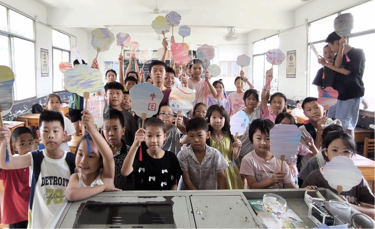 孩子们展示手工制作的漆扇