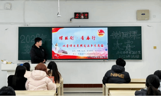 本网讯3月18日下午,外国语学院“凝心聚力担使命,踔厉奋发新征程”主题“微”团课大赛初赛在主校区二教2205教室成功举办。团总支书记代承轩、学生分会执行主席谢芊芊、团总支学生副书记何璨担任评委。李小金担任主持人。