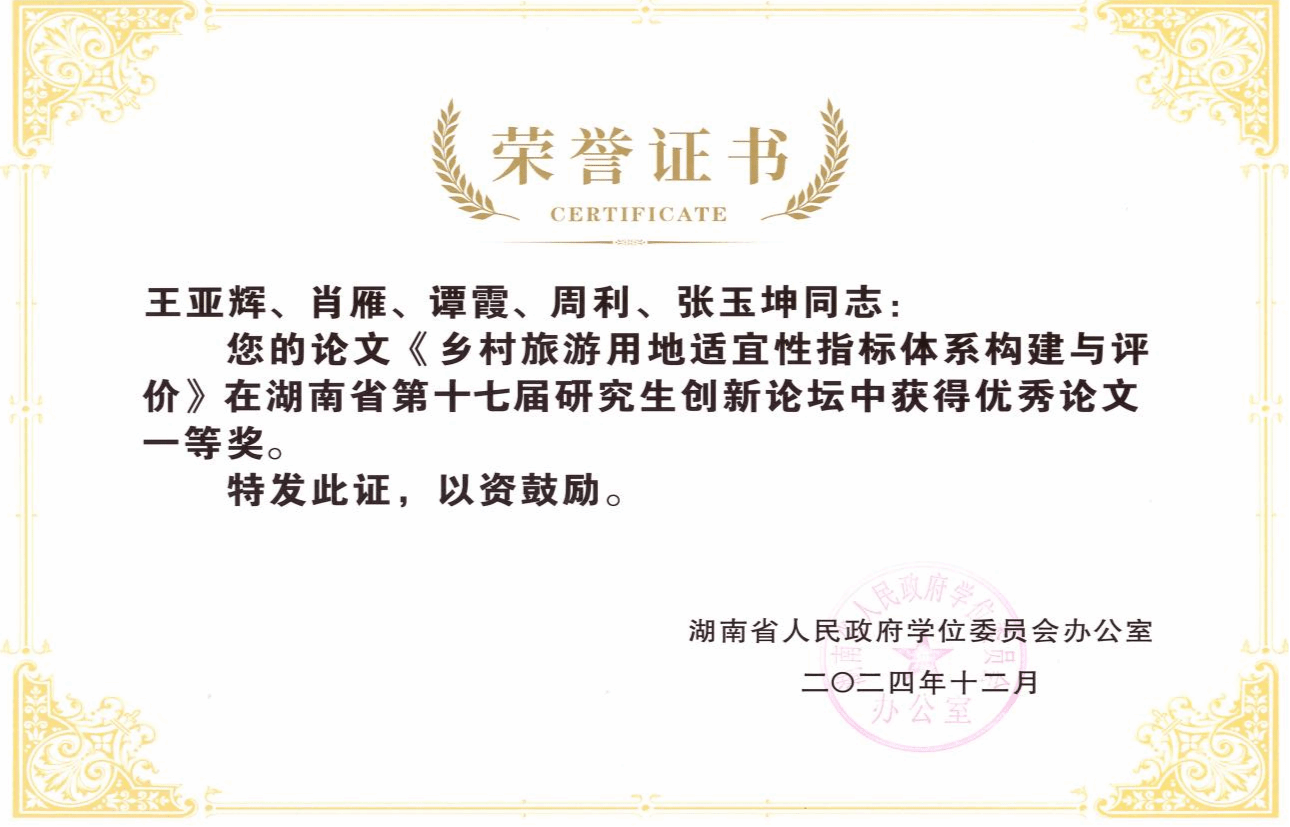 2024年,在带领班级取得各种荣誉的同时,还积极围绕大学生思想政治工作方向开展科学研究,2024年9月,主持立项湖南省高校思想政治工作辅导员骨干(含心理健康教育教师)研究项目“文旅志愿服务促进大学生心理成长的内在逻辑与实现路径研究(24C37)”。2024年12月,谭霞参与撰写的论文“乡村旅游用地适宜性指标体系构建与评价”荣获湖南省第十七届研究生创新论坛优秀论文一等奖。