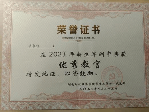 军训实践中,我主动加入训练强度高的国旗护卫中队,担任护旗手。经过十四天的艰苦训练,圆满完成2022级军训结营升旗仪式,并获评“军训先进个人”。2023年暑期,我参加为期20天的教官集训,结业后担任2023级军训教官,以优异表现荣获“军训优秀教官”称号。同时,在国旗护卫队期间,我参与了学校各类重要升旗活动,包括每周一升旗、湖南省农民工运动会升旗仪式等,还亮相湖南省首届农民工运动会开幕式升旗现场。