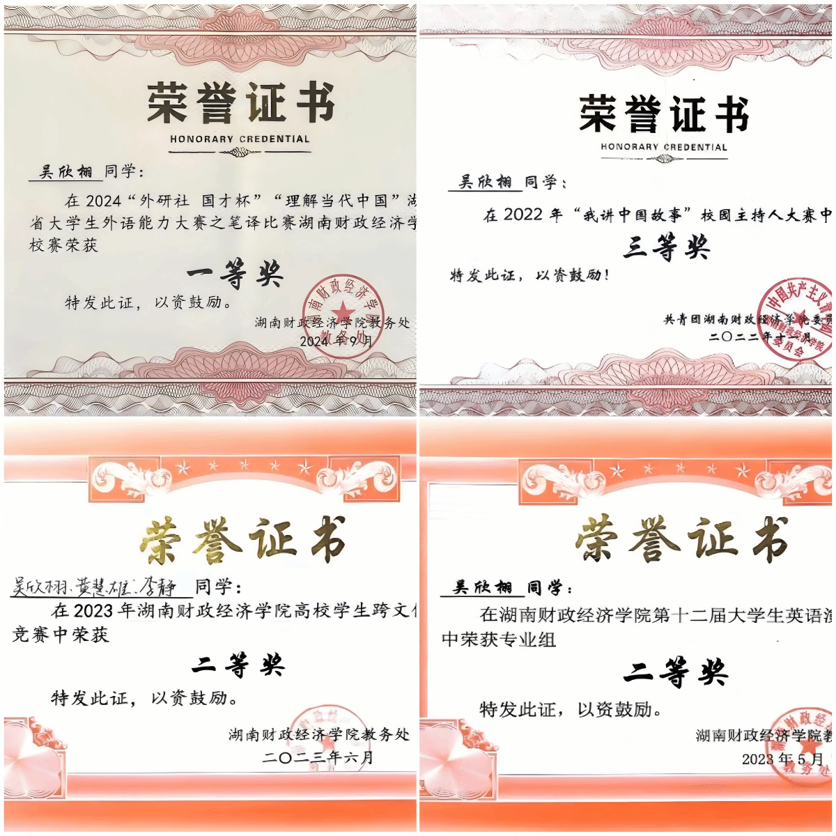 十多年前,我便对主持怀揣热爱与向往,虽家庭条件受限未接受专业指导培训,且外形不占优势,还遭诸多冷嘲热讽与否定,但我毫不气馁。初入校园便入选校主持队,我坚持训练、虚心求教,利用空教室反复练习,终于在2023年以“首选主持人”身份主持校青志协18周年汇演,实现蜕变。此后,我连续主持校五四表彰大会、90周年校庆文艺汇演、大四毕业典礼、影像艺术节等30余场大型活动,荣获湖南省青年文化艺术节朗诵铜奖以及校园主持人大赛、五四演讲大赛、中华经典诵读大赛等多项大赛前四名荣誉,还数次在开学典礼、毕业典礼、军训阅兵式等重要场合担任朗诵嘉宾。
