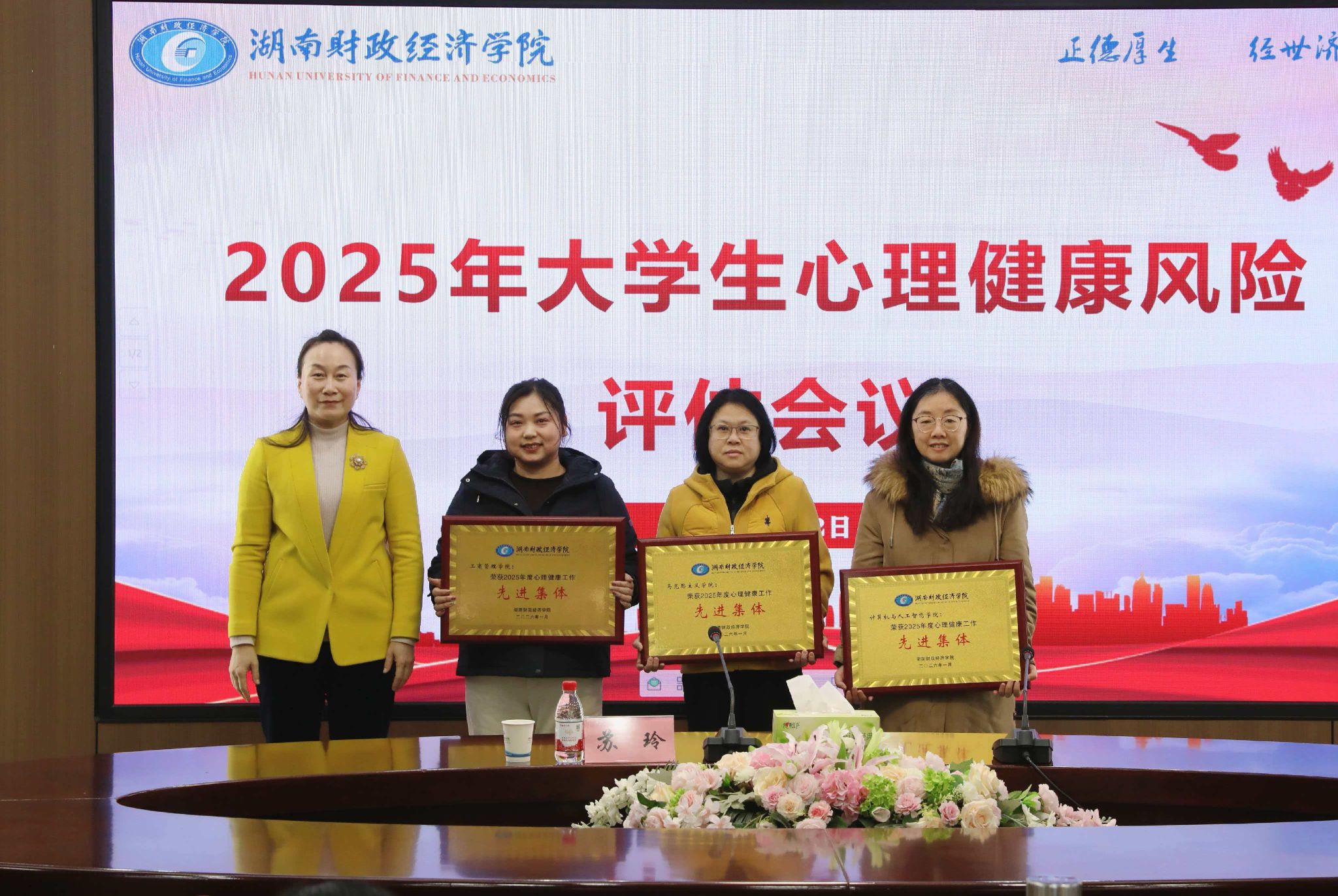 会议首先对2025年度心理健康工作中表现突出的集体和个人进行了表彰。工商管理学院、计算机与人工智能学院、马克思主义学院获评“心理健康工作先进集体”,12名教师荣获“心理健康工作先进个人”。苏玲校长为获奖代表颁发荣誉证书。
