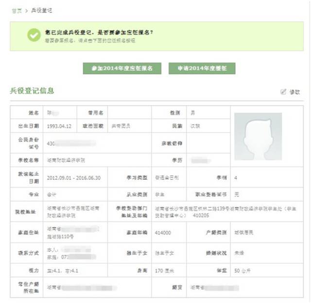 填写相关资料之后出现以下界面表示已完成兵役登记。