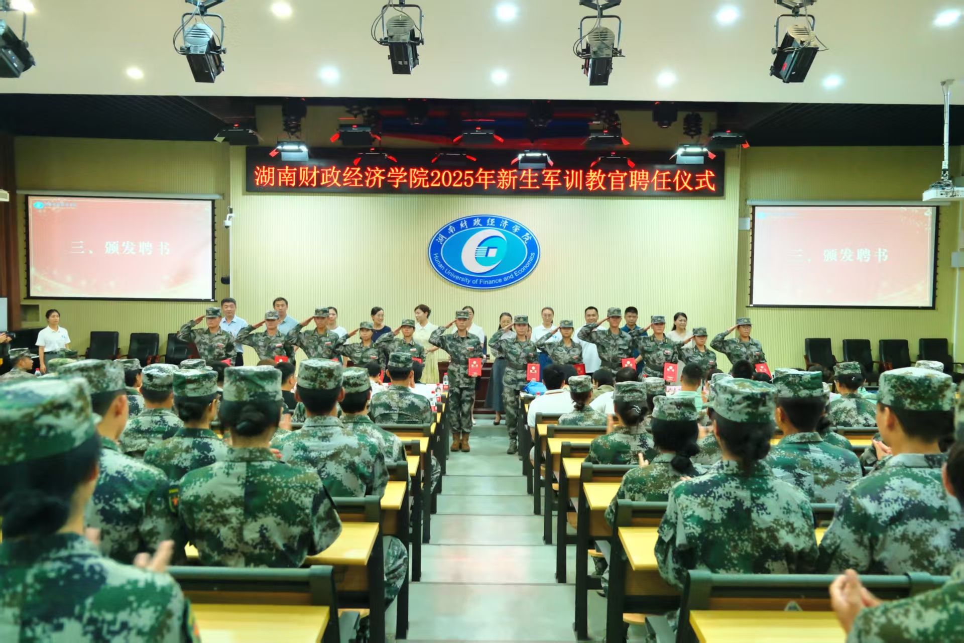在全体队员齐声高唱国歌后,仪式正式开始。学生工作部部长欧阳海峰宣读了2025级新生军训教官聘任文件,来自各二级学院的90名在校生被正式聘任为2025级新生军训教官。各二级学院学工负责人为受聘教官颁发聘书。