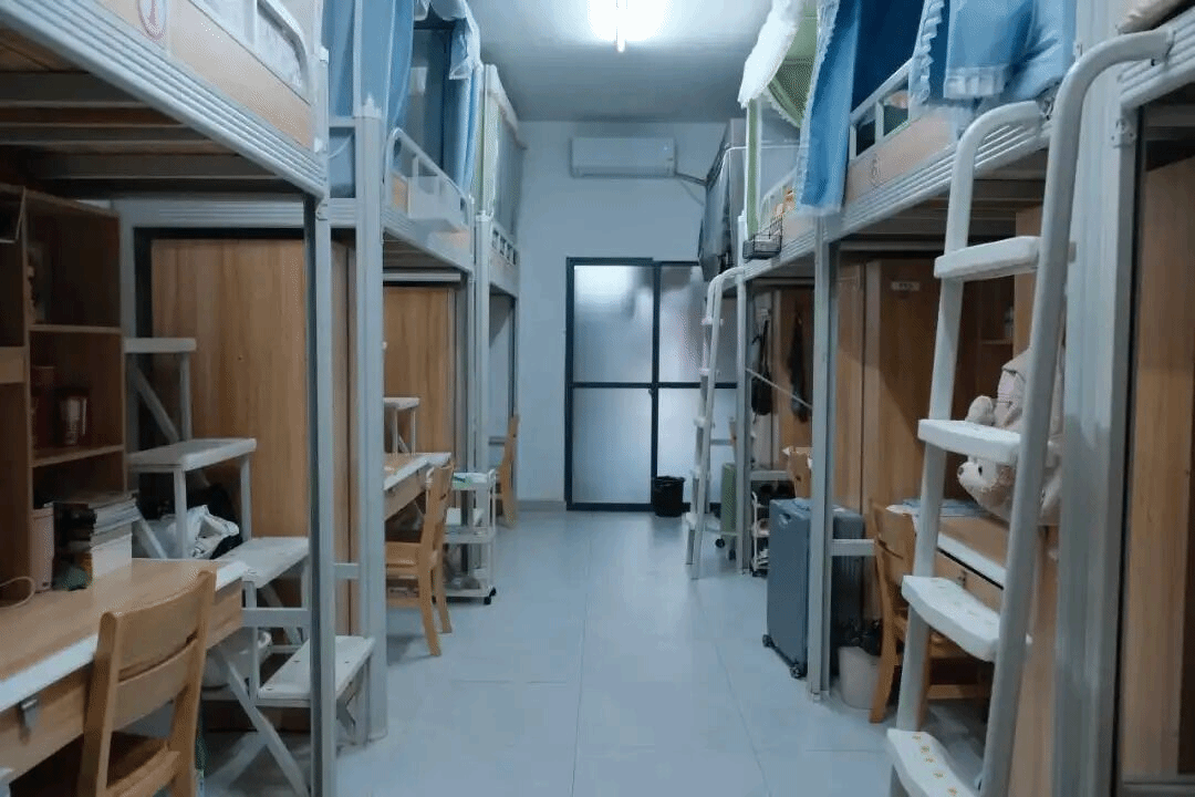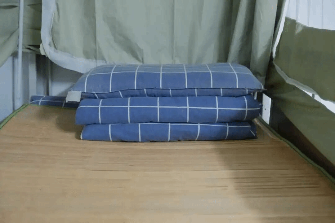 “叠、压、折、捋、修”——这是棉被从“松软”到“方正”的必经过程。在教官的指导下,同学们全情投入:有人跪在床边仔细压角,有人俯身反复捏线,有人蹲着修整折痕。汗水顺着脸颊滑落,但动作一丝不苟。一床床被子逐渐方正挺括,变成了有棱有角的“豆腐块”,展现出新生的专注与坚持。