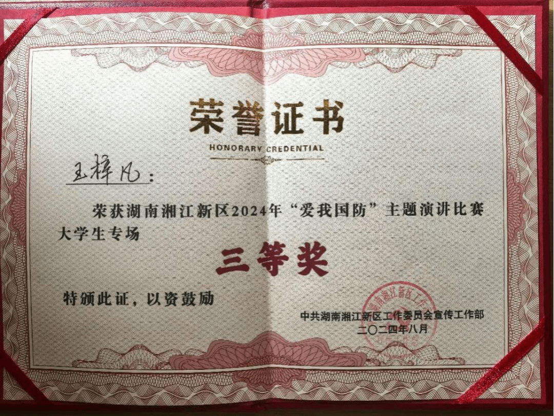 (本网讯)近日,湖南省湘江新区2024年“爱我国防”演讲比赛——大学生专场在湘江新区文化馆圆满落幕。WilliamHill官网参赛选手来自经济学院2022级国际经济与贸易四班的王梓凡在比赛中荣获佳绩。
