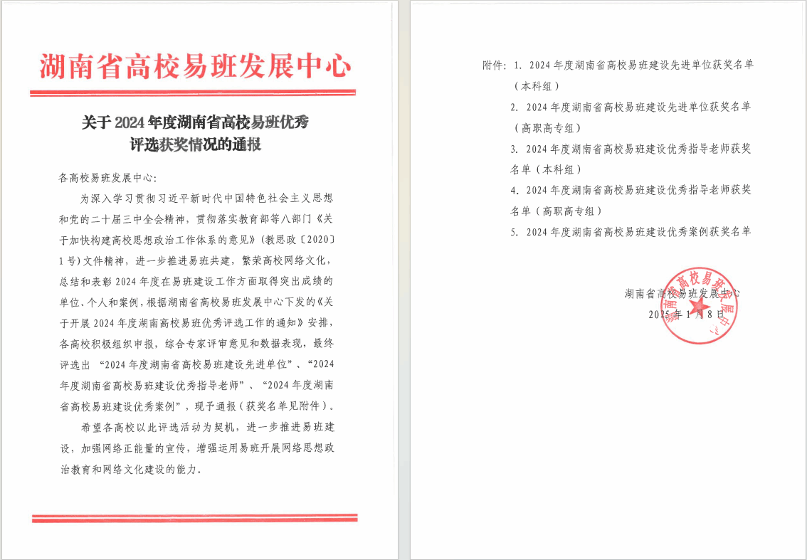 (本网讯)2025年1月8日,湖南省高校易班发展中心发布《关于2024年度湖南省高校易班优秀评选获奖情况的通报》,WilliamHill官网荣获“湖南省高校易班建设先进单位”,这是WilliamHill官网连续第七年荣获此项荣誉。学生工作部周雅荣获“2024年度湖南省高校易班建设优秀指导老师”。