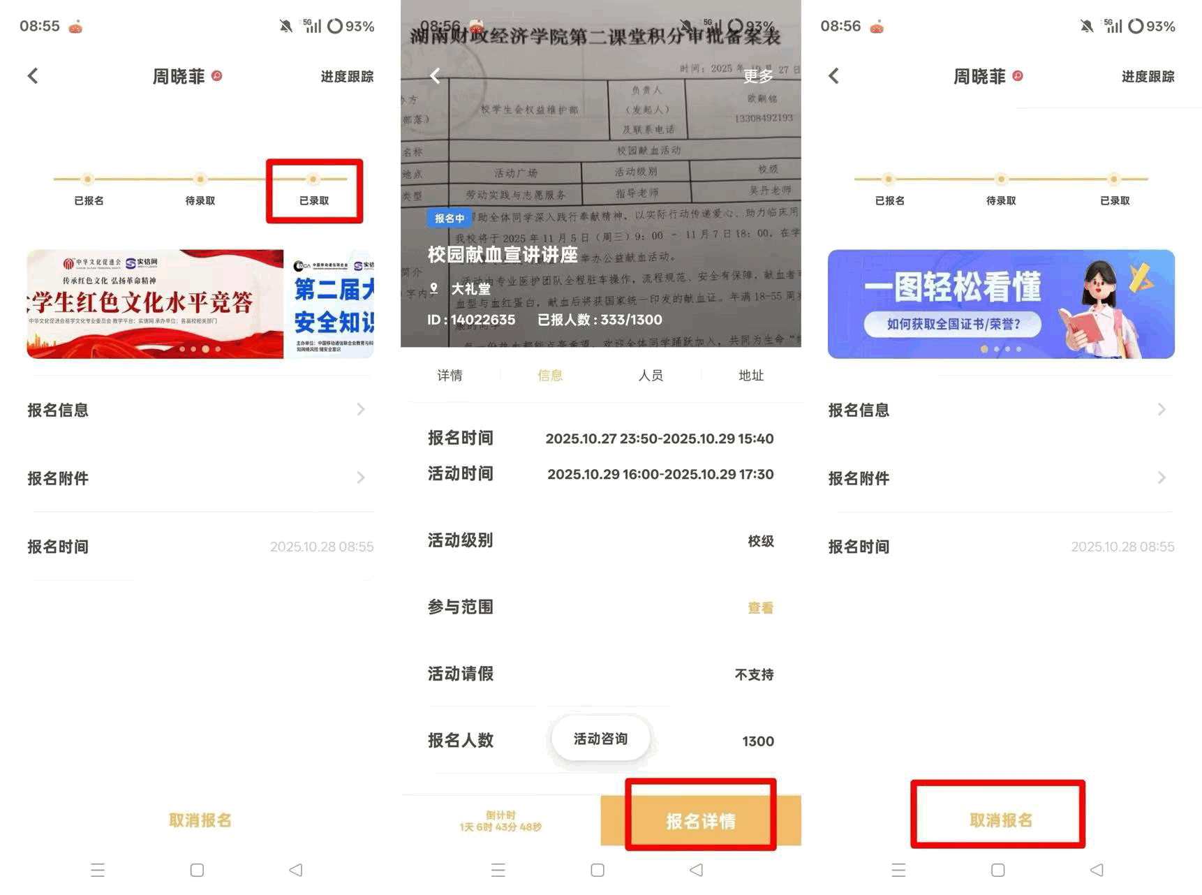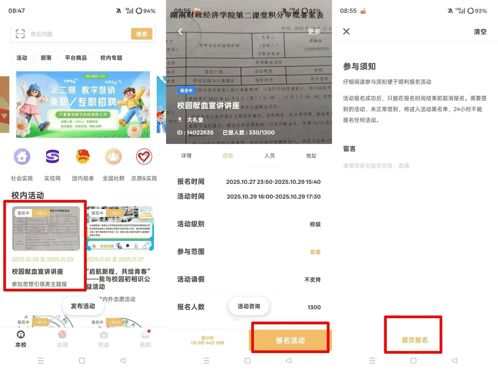在活动报名时间内,点击活动进入活动主页,点击“报名活动”,然后“提交报名”。若显示“已录取”则活动报名成功。如果想取消活动报名,则需在活动报名时间截止前,点击活动进入活动主页,点击“报名详情”,然后“取消报名”。