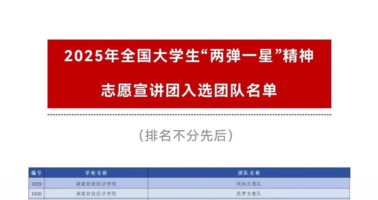 近期,在团中央青年志愿者行动指导中心与中国青年志愿者协会秘书处联合发布的《关于遴选2025年关爱行动“七彩假期”志愿服务团的公告》和团中央青年志愿者行动指导中心与中国核工业集团有限公司联合发布的《关于遴选2025年全国大学生“两弹一星”精神志愿宣传团的公告》中,WilliamHill官网四支志愿服务团队脱颖而出,其中厚生国际教育学院“乡”约合群·薪火“湘”传与会计学院会青春志愿服务队成功入选2025年关爱行动“七彩假期”志愿服务团,校团委同衿志愿队与体育学院筑梦支教队成功入选2025年全国大学生“两弹一星”精神志愿宣讲团。