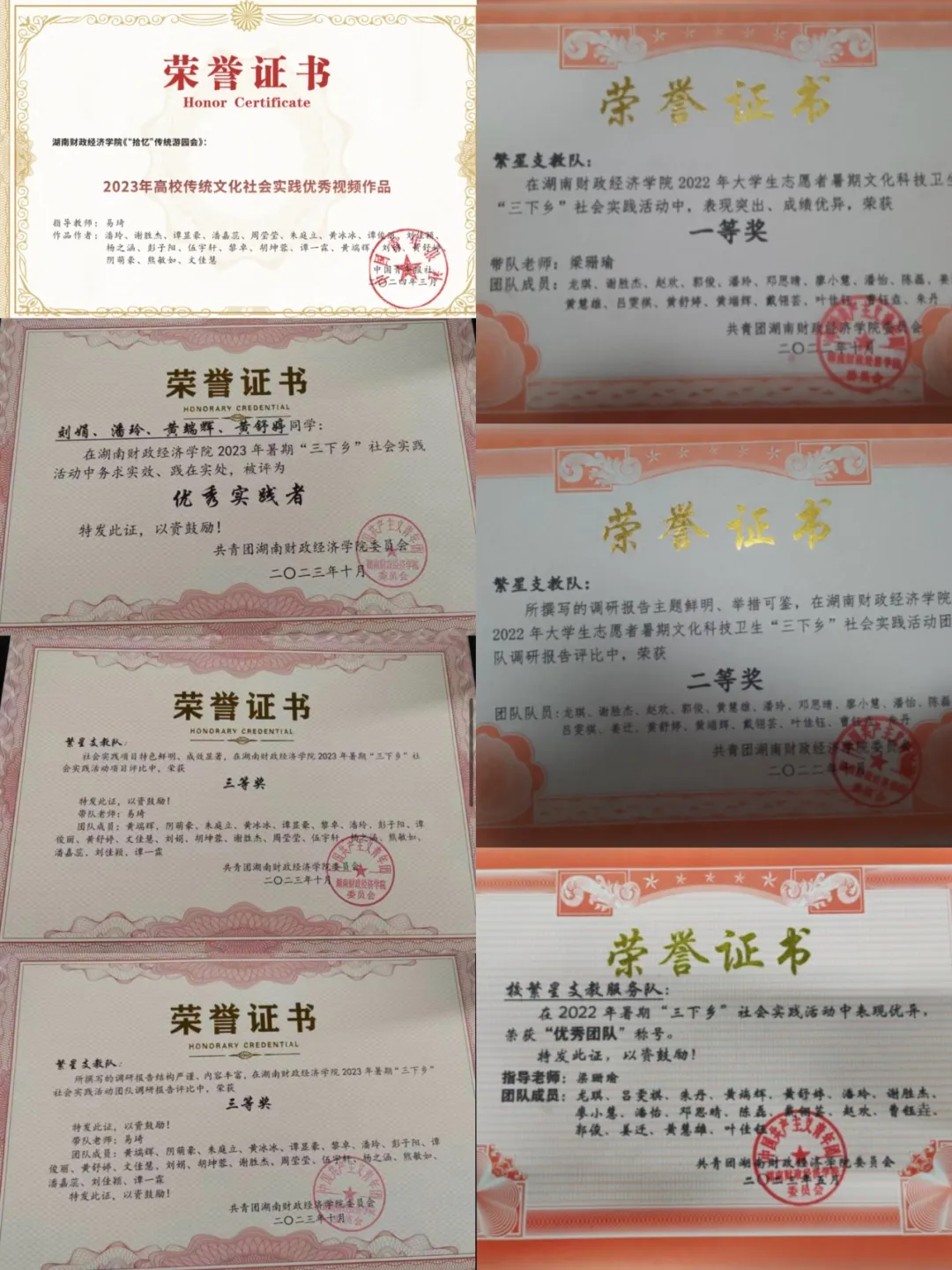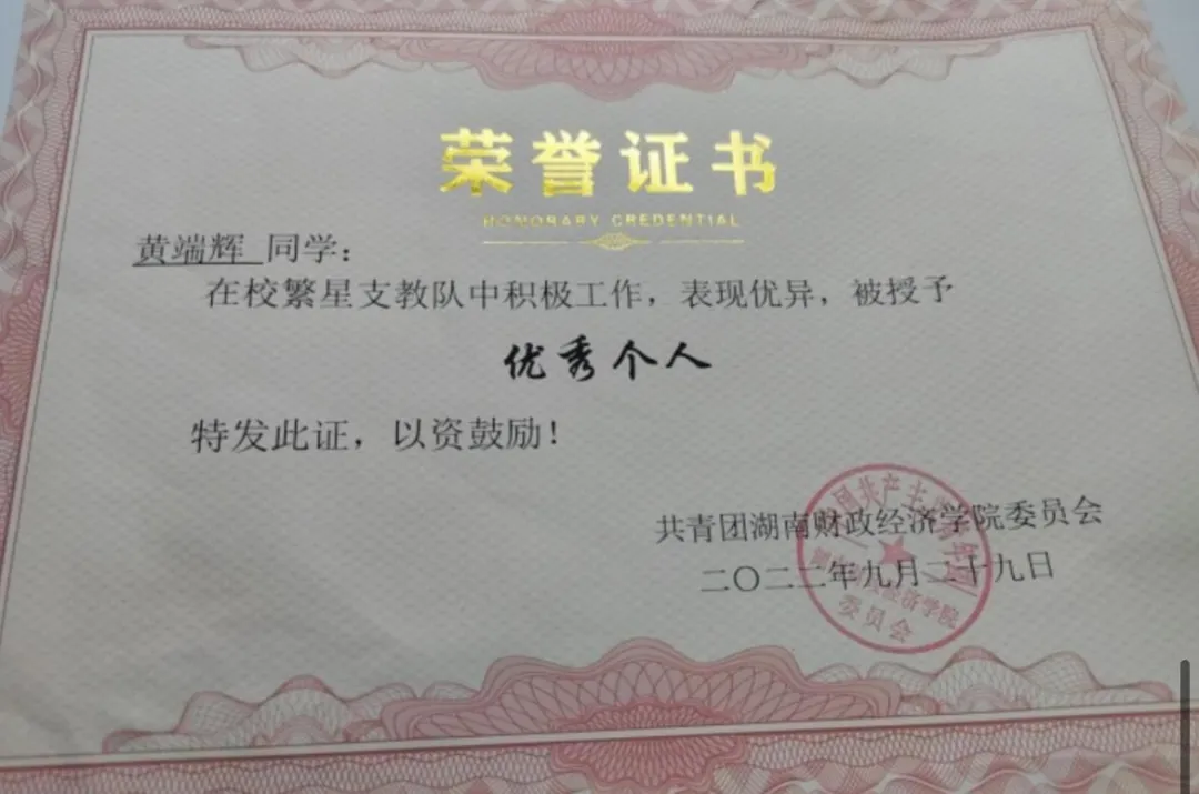 暑期三下乡活动是黄端辉大学生活中浓墨重彩的一笔。2022年,他所在的繁星支教队荣获“全国重点团队”,校内评比获“优秀项目”第一名 ,团队调研报告获二等奖,还收到了当地的感谢信。此外,在国家级媒体中青校园累计发稿33篇,个人调研报告发表3篇;省级媒体“新湖南”发表稿件1篇;在实践地发表稿件2篇;在校级媒体“湖财青年”微信公众号发稿3篇。2023年,作为队长的他带领队伍成功申报“圆梦工程”项目,收到大塘光彩学校校长的一封感谢信,并在中青校园、人民日报、新湖南、华生在线、学习强国、网易新闻、魅力潇湘网、娄底新闻网、中国新报、中国网、中国发展网、新双峰、双峰教育、湖财青年等校内外多家知名媒体报道,浏览量共计二十万余次。队伍斩获2023年暑期“三下乡”社会实践活动“优秀项目”、“优秀团队调研报告”三等奖,队内成员获得省级“优秀个人”、校级“优秀实践者”、“优秀撰稿员”、“优秀个人调研报告”奖项。