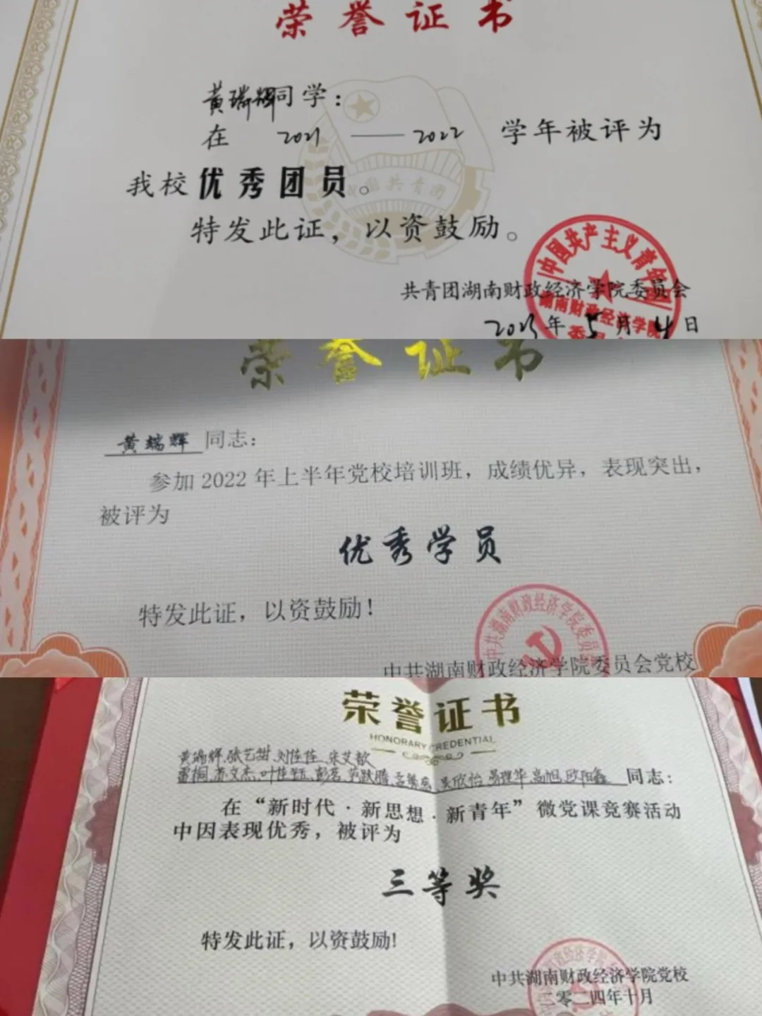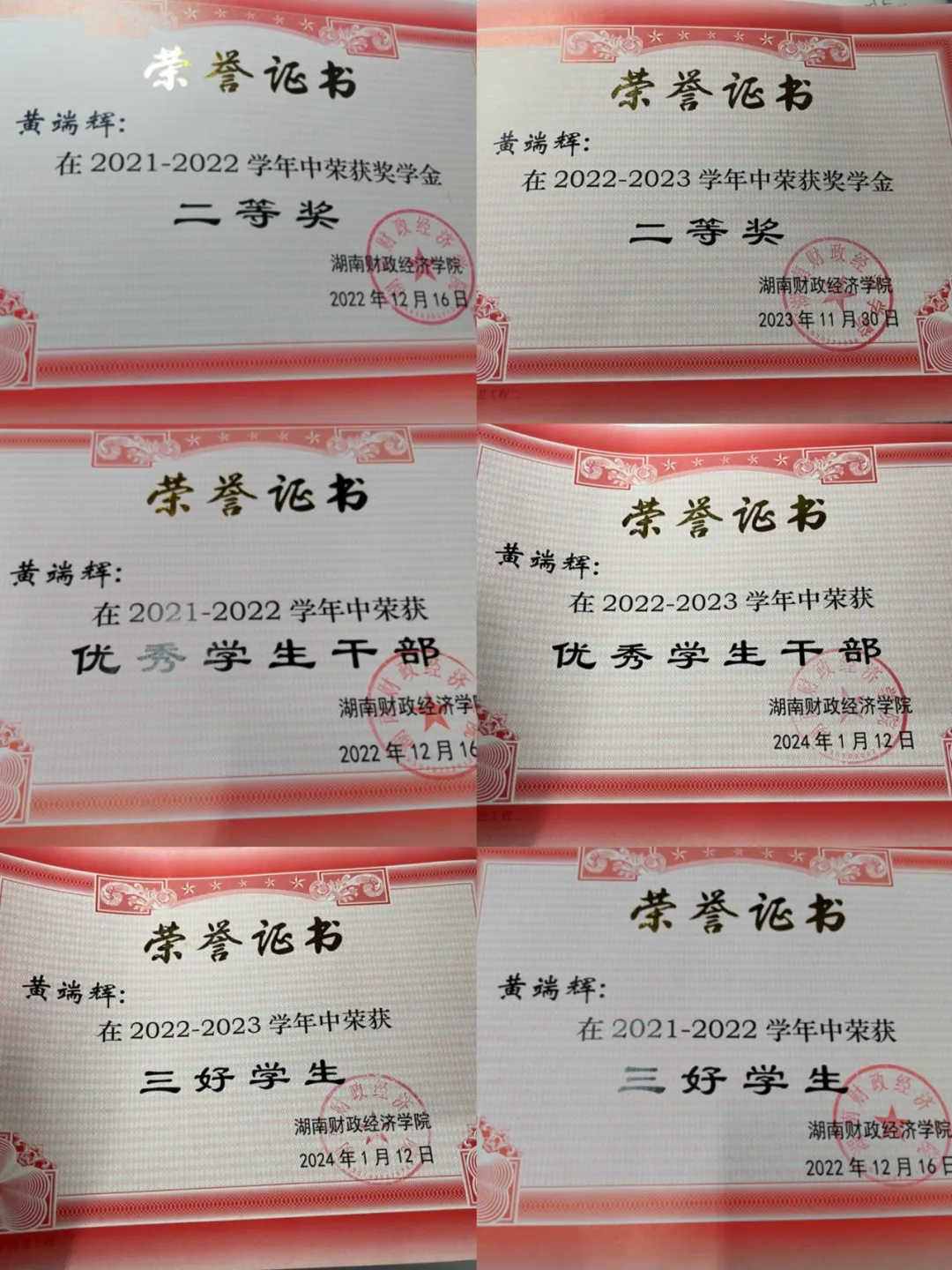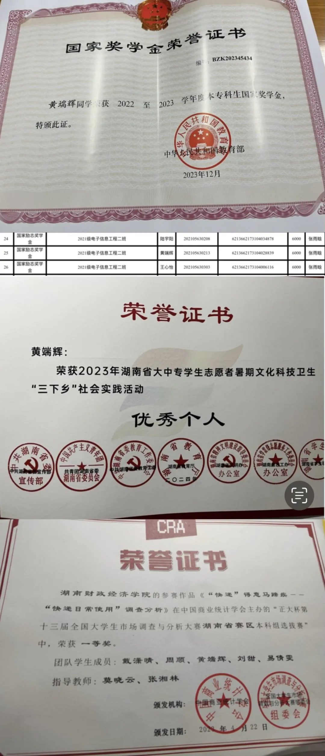 在荣誉方面,黄端辉收获颇丰,累计获得国家级荣誉3项、省级荣誉2项、校级荣誉60余项,涵盖奖学金与各类竞赛奖项 ,如“2022 - 2023学年国家级奖学金”、“2023-2024学年度国家励志奖学金”、“全国三下乡省级优秀个人”以及“市场调研大赛省级一等奖”等。