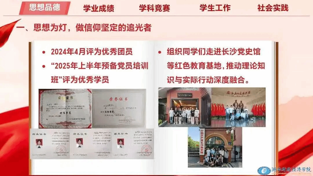 她把理想藏进行动,把信念落在脚下。初心如磐,笃行致远,从递交入党申请书的那一刻起,她始终以党员标尺严于律己,积极参与组织生活,淬炼本领。在2025年上半年预备党员培训中荣获“优秀学员”称号。课余时间她主动组织同学们走进长沙党史馆等红色教育基地,推动理论知识与实际行动深度融合,在思想淬炼中砥砺前行。