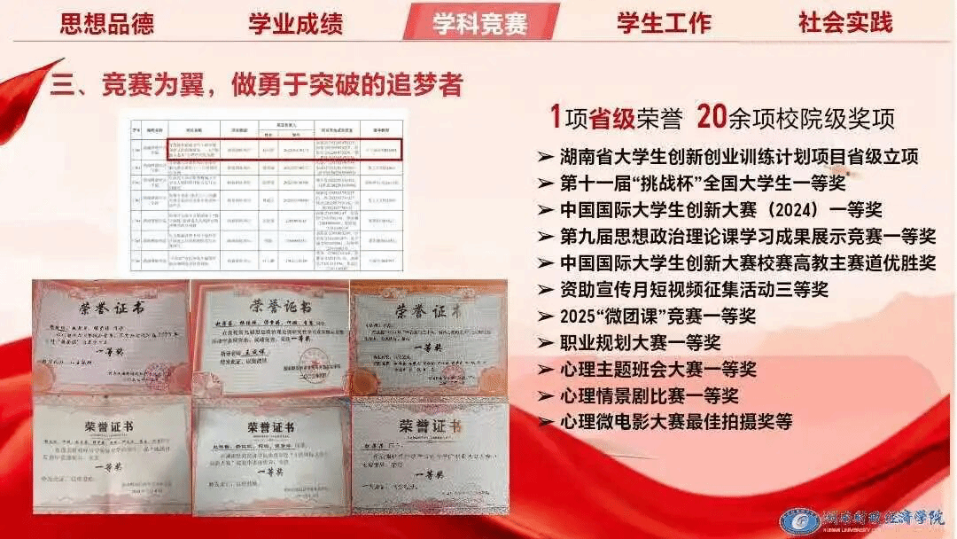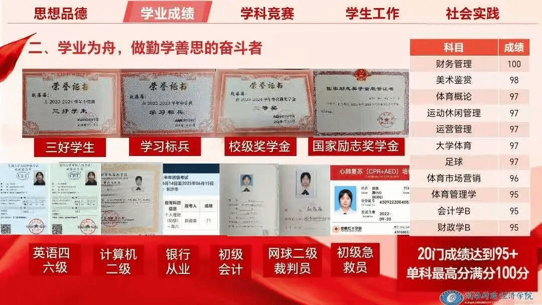 她以勤为楫、以韧为帆。大学三年不负韶华,在书山书海中摘下一枚又一枚成长的勋章。网球项目二级裁判员证书、心肺复苏培训证书、国家励志奖学金荣誉证书……一本本证书是她为知识写下的注脚,一次次获奖是她向成长交出的优秀答卷。