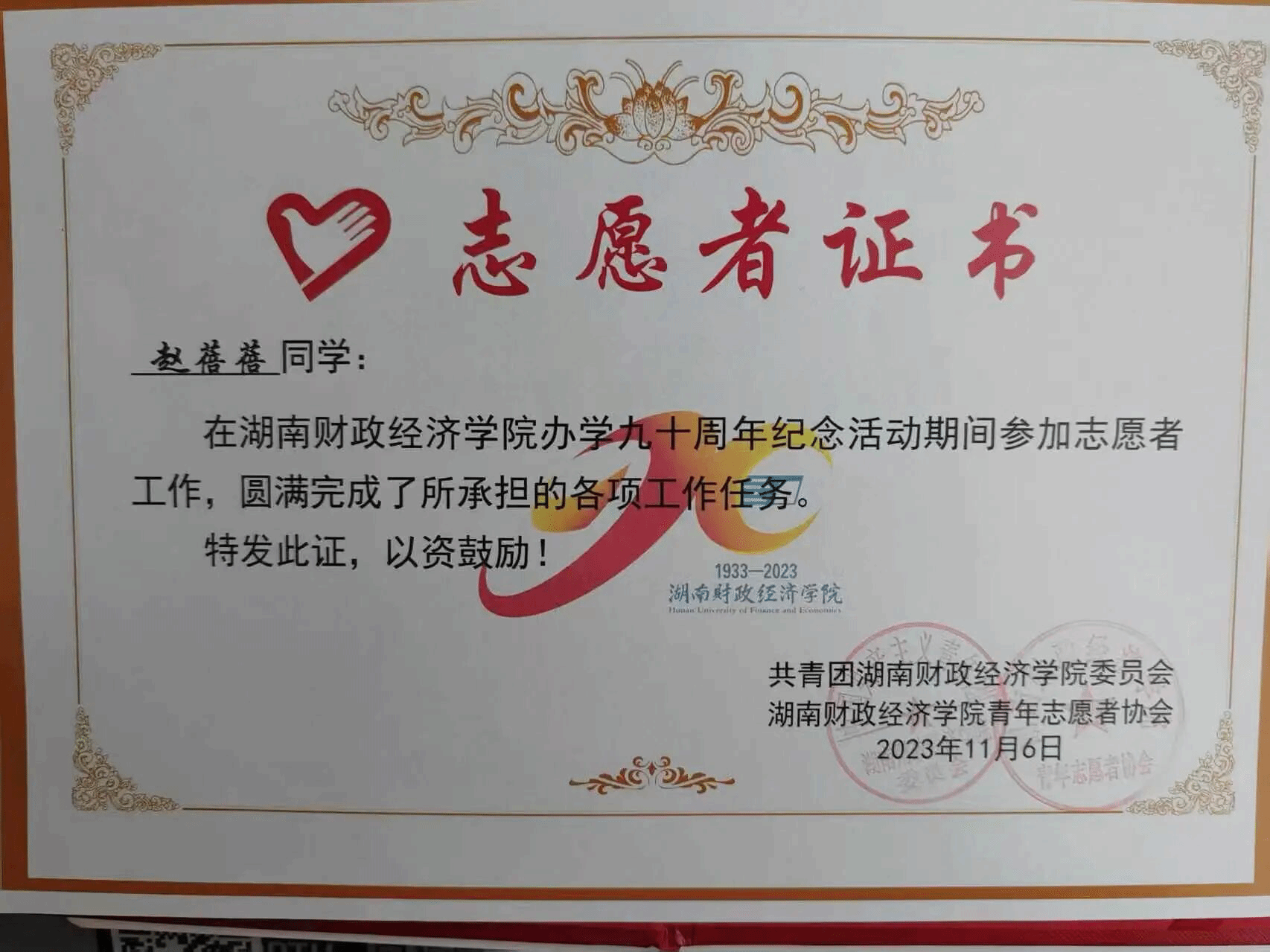 哪里有需要,便在哪里扎根绽放。落地,就可以生根发芽。赵蓓蓓就像这朵花,虽在万花之丛不显张扬,她始终坚守在服务同学奉献社会的第一线。连续两年参与暑期社会实践、在“返家乡”行动中助力基层治理,期间协助村政府推广“湘易办”APP,在“向新力”体育志愿服务队中担任调研组组长,以实际行动传递爱心与温暖,后续成功入选七彩假期项目。