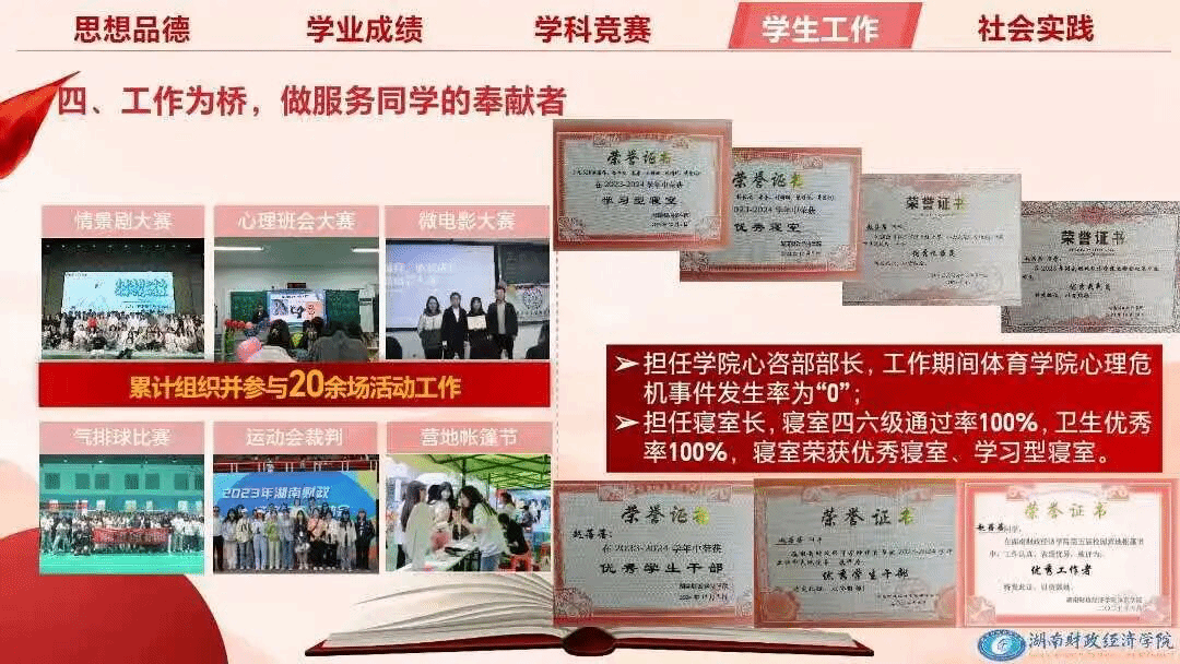 身为寝室长,她以身作则积极营造和谐奋进的寝室氛围。在她与室友的共同努力下寝室四六级通过率100%、卫生优秀率100%,荣获“优秀寝室”、“学习型寝室”称号。从寝室长到心咨部部长、从课堂深耕到赛场拼搏,她用责任与热爱把每一个身份都演绎出独属于自己的魅力,让芳香温暖人心。
