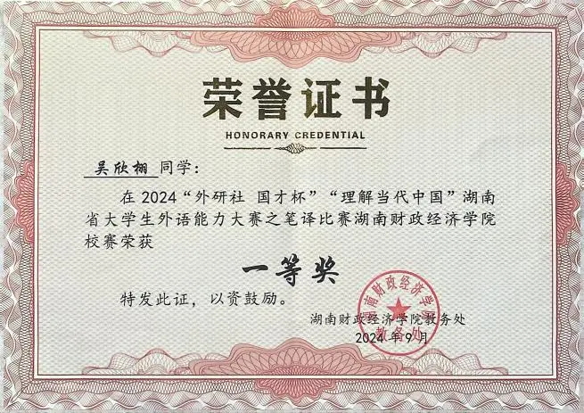 乘风破浪,直挂云帆:在生活的风雨中,总有一些人选择砥砺前行。吴欣栩就是这样的,为了减轻家庭负担,他努力通过兼职工作赚取自己的生活费和学杂费。考入湖财后,他更是将生活的压力和自己的理想转化为动力,不断地乘风破浪,成功获得了国家励志奖学金、校二、三等奖学金、三好学生、优秀学生干部、优秀团员等荣誉称号,以及获国家英语演讲比赛全国三等奖等国家级奖项2项,湖南省青年文化艺术节朗诵总决赛铜奖等省级奖项3项,外研社国才杯笔译大赛、用英语讲好中国故事短视频大赛一等奖等校级奖项23项。