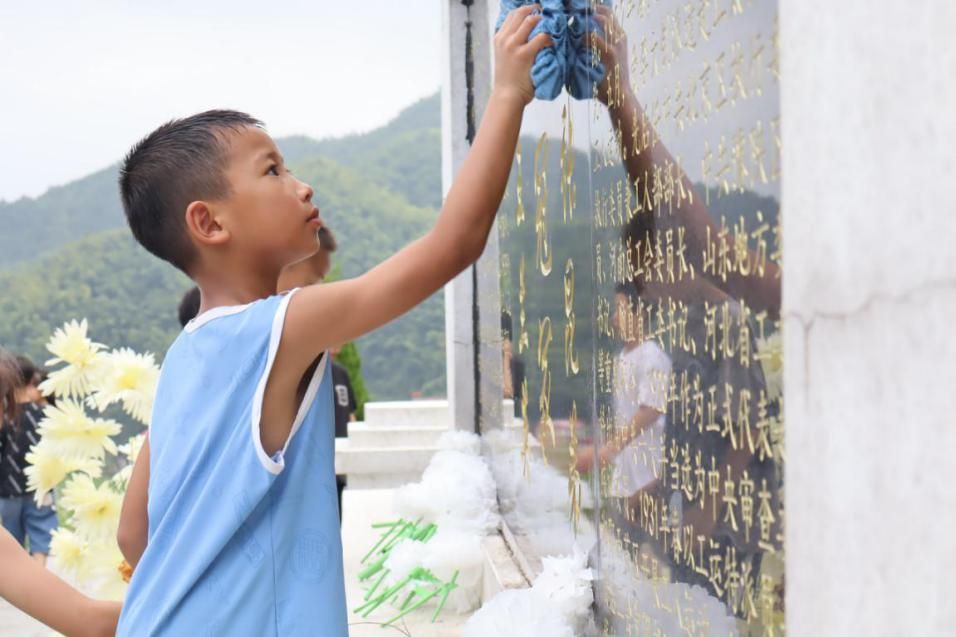 随后,志愿者们分发扫帚、抹布,俯身为孩子们调整握姿。小家伙们立刻围拢在纪念碑基座旁,蹲成一圈小小的"清扫阵",他们动作轻缓,神情专注,手指捏着抹布边角来回摩挲,直到把缝隙清理干净,才仰起满是汗珠的脸朝志愿者露出腼腆的笑。阳光穿过松针洒下斑驳的光点,混着孩子们"这里还有点灰"的嚷嚷声,让肃穆的陵园里多了几分乡村特有的活泼生气。