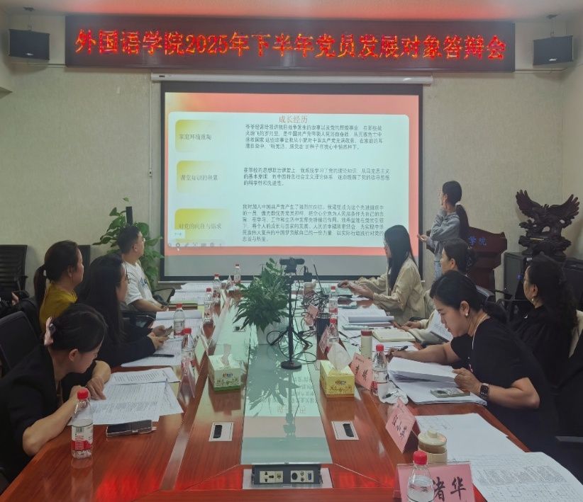为严格发展程序、保障党员质量,选拔和培养合格的党组织后备力量,9月24日13时,外国语学院于办公楼315会议室召开了2025年下半年党员发展对象答辩会。外国语学院党委书记凌飞、副院长李曦、副院长汪小英、党委副书记张鹏、各党支部书记、团总支书记及辅导员出席会议。2025年下半年党员发展对象候选人参加此次会议,会议由党支部书记杨舒淇主持。