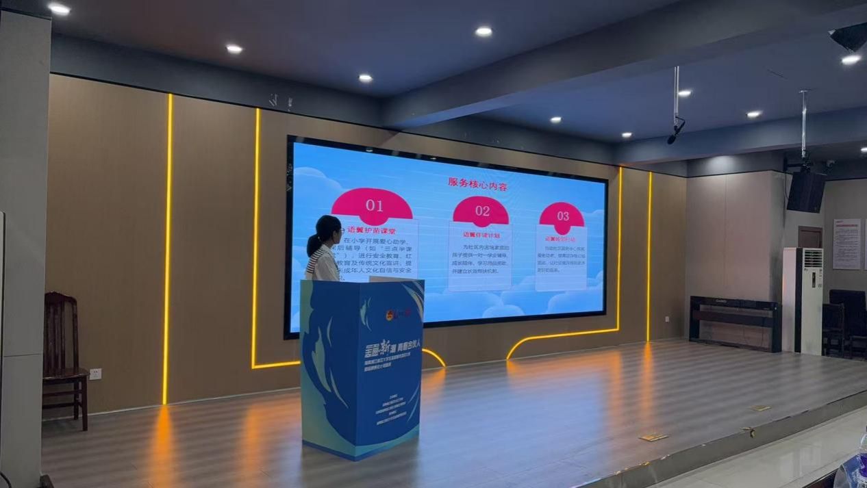团队发言人薛仪同学介绍到,该项目以“语翼护苗课堂”“语翼伴读计划”“语翼睦邻行动”为核心服务内容,通过“高校-社区-家庭”三位一体资源闭环、“英语+”主题融合教育、“菜单式+定制化”服务组合及数字化管理平台等创新举措,有效回应了社区青少年课后辅导、困境儿童长效帮扶及社区治理力量补充等现实需求,其清晰的逻辑架构与扎实的现场呈现,充分彰显了该项目在资源整合与专业解决方案构建上的突出能力。