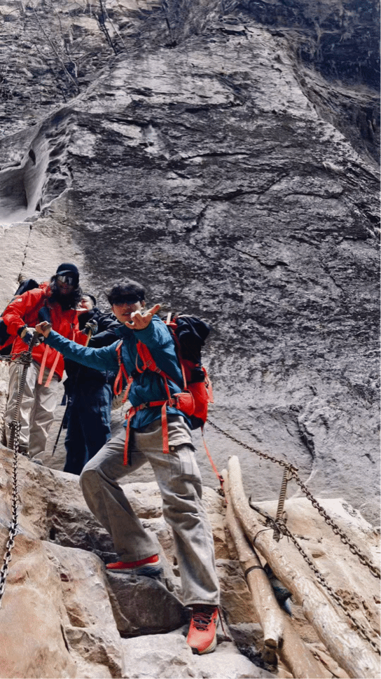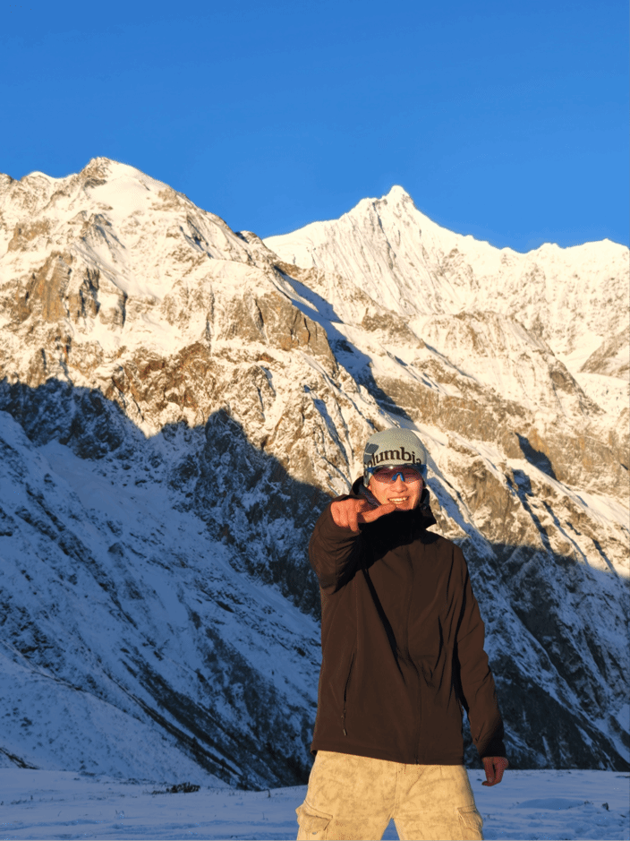 邓钊同学踏上“卡瓦格博之心”重装徒步路,在零下20℃的雪域高原、3500米的高海拔地带,直面暴雪突袭与严寒考验,始终迎难而上、稳步前行。登顶之时,朝阳映照雪山,所有艰辛都化为对自然的敬畏与勇攀高峰的信念,彰显体育学子的无畏勇毅。