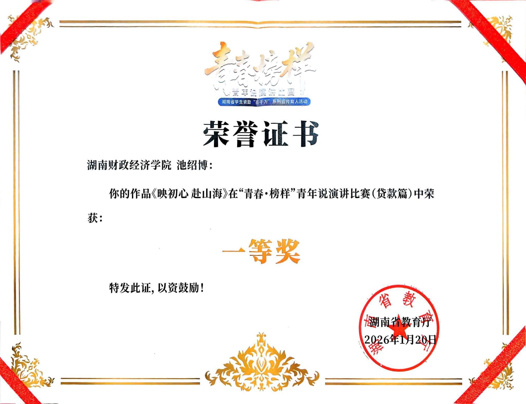 近日,2026年湖南省学生资助“百千万”系列宣传育人活动评审结果正式揭晓。人文与艺术学院2024级网络与新媒体专业四班学生、退伍军人池绍博凭借作品《映初心 赴山海》,在“青春·榜样”青年说演讲比赛(贷款篇)中脱颖而出,荣获省级一等奖。该作品由学院学工办主任徐晶老师悉心指导,充分展现了我院学子感恩奋进的精神风貌。