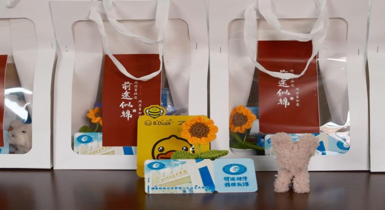 学院为考研学子精心准备“前程似锦”暖心礼袋,礼袋中的向日葵代表着一举夺“魁”,玩偶寓意“笑意”迎考,每一份礼袋中还有辅导员老师手写考研祝福贺卡,寄托着学院对考研学子们的亲切关怀和殷殷祝福,期望同学们在考场上展现最出色的自己。