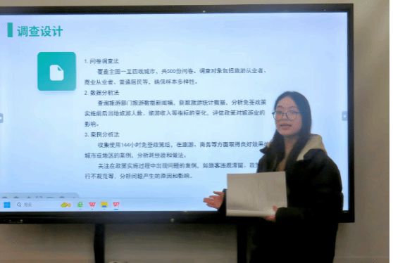 此次参赛作品聚焦144小时免签政策和大学生志愿服务等社会领域热点问题,由张可可和余雅诗两位同学分别从研究背景、研究意义、研究内容和研究结论与启示阐述小组项目。各组展示完毕后,评委老师围绕作品内容、表达能力和PPT展示等方面进行了评价和分析,帮助选手了解作品的不足,鼓励同学们进一步打磨和改进方案,争取拿出更优秀的作品。经评委老师商议,推选《双重赋能:志愿动机量表开发及其对可持续志愿服务影响路径研究》参加校赛。