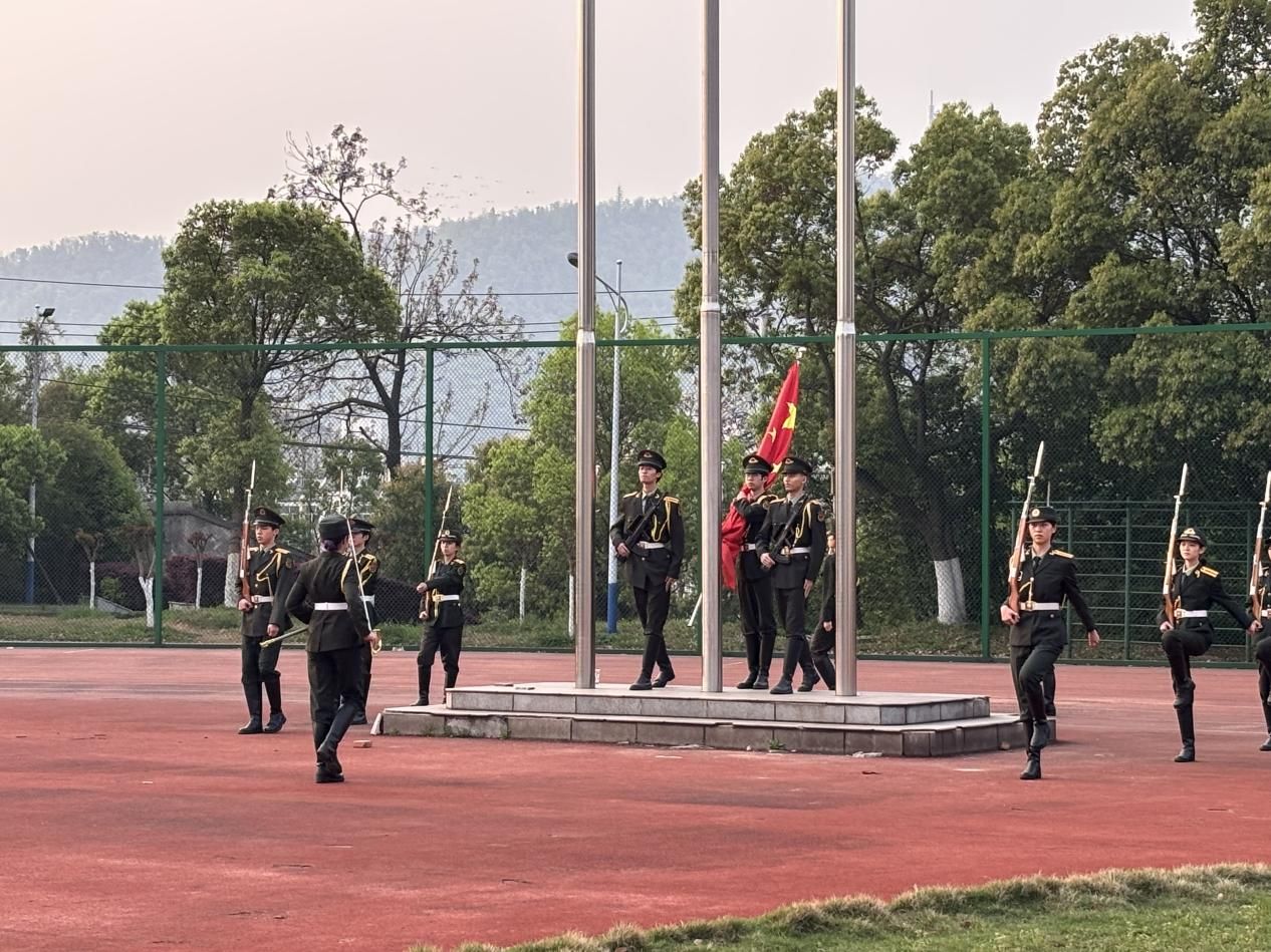 7点整,国旗护卫队迈着整齐的步伐护送国旗入场,在雄壮的国歌声中,五星红旗冉冉升起,全体师生肃立注目,向国旗致以崇高敬意。