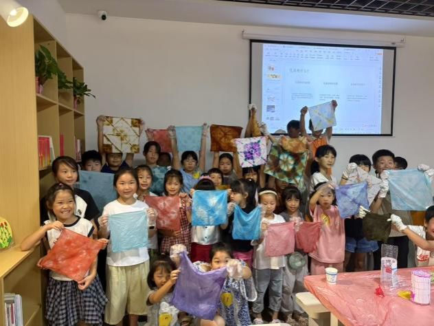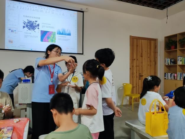 课堂的另一幕,成了蓝白交织的艺术天地。志愿者们以生动的故事开篇,为孩子们铺开扎染的千年画卷:从秦汉时期的“缬”工艺,到明清时期的民间普及,这项以针缝线扎控制染色的技艺,每一道纹理都藏着古人的生活智慧。