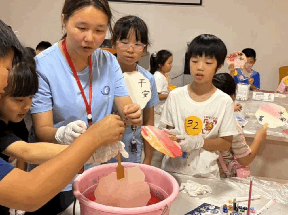 活动现场,一滴朱砂入清水,瞬间晕开如晚霞;一点石绿轻搅,便似春水映苔痕。孩子们屏住呼吸,看着空白扇面轻触水面,一提一沉间,斑斓色彩便在扇面绽放。“我要加金色!”“我想画个太阳!” 孩子们的奇思妙想,让传统漆艺焕发童真光彩。当第一把自制漆扇晾干,10 岁的小雨举着它跑向老师,古扇的雅致与孩童的活泼在此刻完美交融。
