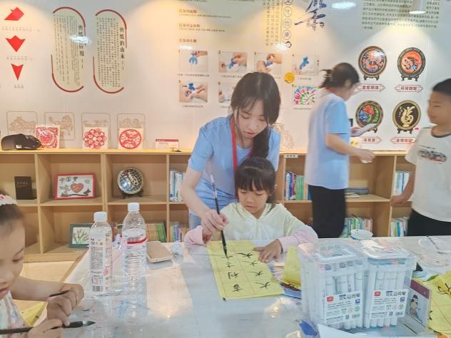 在实操环节,志愿者们俯下身,手把手教孩子握笔、运笔。随后,鼓励孩子们自己动手,他们用稚嫩的小手生涩的拿着毛笔,蘸上墨“颤颤巍巍”的开始了他们的“创作”,当孩子们不经意间被墨汁偷袭时,他们调皮地对着同伴做个鬼脸,又埋头沉浸在笔墨世界里,教室里的墨香混着孩子们的笑声,酿成了最清甜的夏日滋味。