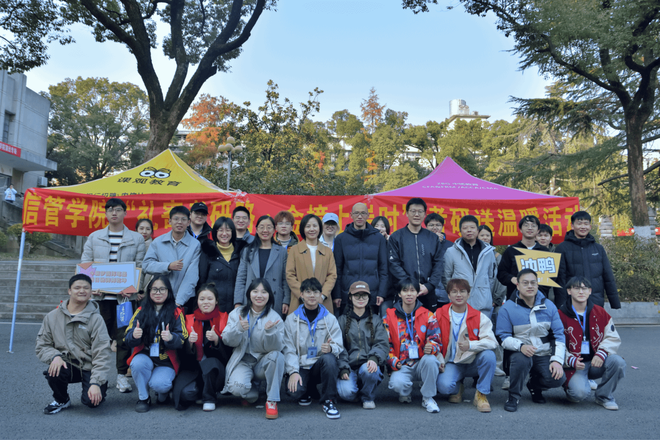 (本网讯)为帮助考研学子坚定信心,缓解备考压力,12月18日下午,信息技术与管理学院在主校区大礼堂前开展“礼寄考研路 金榜上岸时”2025届考研学生慰问活动,学院党委书记李映泉、院长黄国华、副书记唐雄伟、综合办主任戴亮、教科办主任王青、团总支书记李雨希、毕业班辅导员、教师代表及团学会干部来到活动现场,共同为考研学子送上温暖与力量。