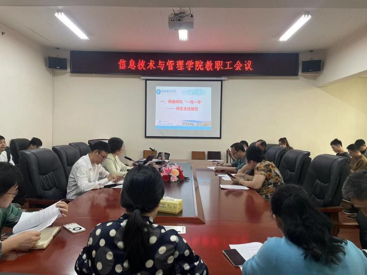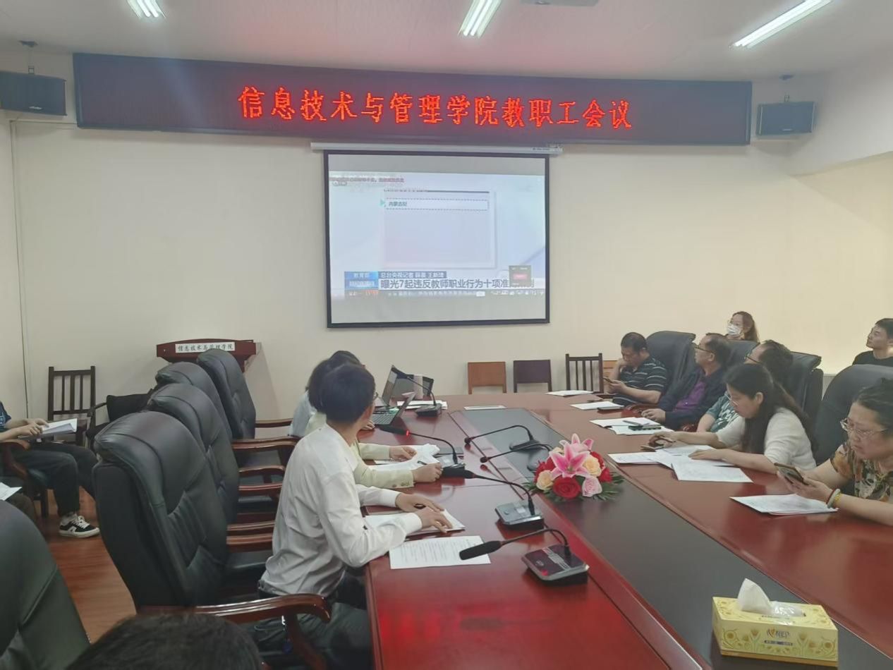 根据《WilliamHill官方网站进一步强化师德师风建设的若干措施》工作要求,4月23日下午,信息技术与管理学院召开全体教职工大会,开展师风师德建设专题学习、警示教育,并组织全体教师签订《师风师德承诺书》。会议由学院党委书记李映泉主持。