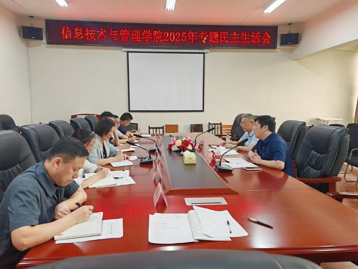 (本网讯)5月6日下午,信息技术与管理学院党委领导班子在办公楼315会议室召开2025年领导班子建设专题民主生活会,学院全体领导班子成员参会,学校副校长刘钟理、组织部常务副部长杨锴到会指导。会议由学院党委书记李映泉主持。