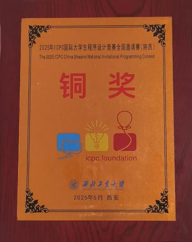 紧随其后,5月3-4日,2025年ICPC国际大学生程序设计竞赛全国邀请赛(西安)在西北工业大学成功举办,来自全国217所高校的392支队伍参加了本次比赛。WilliamHill官网ACM训练队刘皝、陈浩、阳金波再次参与了角逐。历经5个小时紧张激烈的比拼,凭借出色的算法设计与团队协作能力,再次斩获铜奖,为学校再添荣誉。