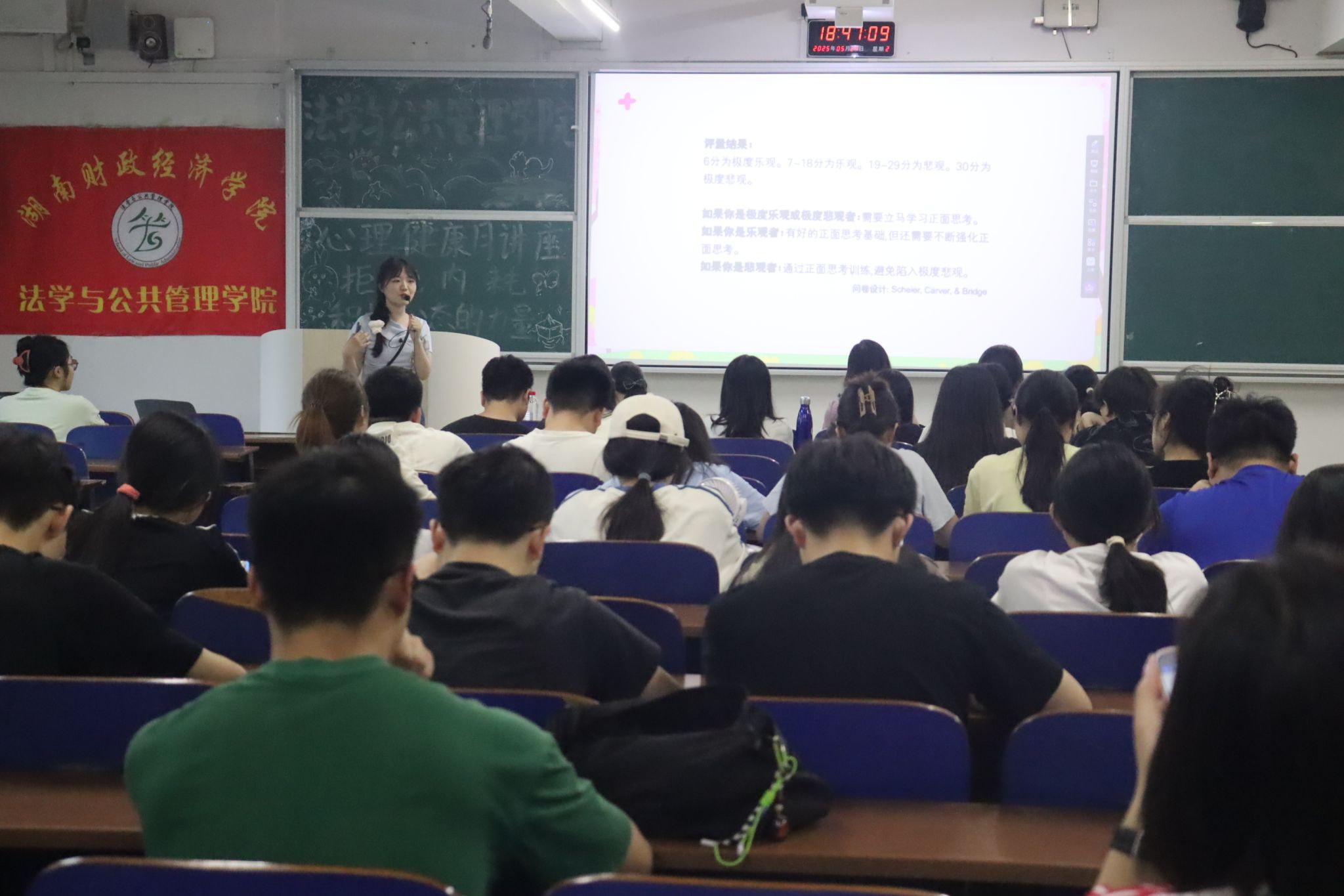 (本网讯)5月27日晚,信息技术与管理学院联合法学与公共管理学院、马克思主义学院在主校区三教学楼3109 教室举办以“拒绝内耗:积极心态的力量”为主题的心理健康知识宣讲活动。学校心理健康教育与咨询中心向靓老师担任主讲,曾娟、吴彩虹老师现场指导,信息技术与管理学院学工办副主任陈慧、法学与公共管理学院学工办主任彭兰及百余名心理委员、朋辈辅导员参与活动。