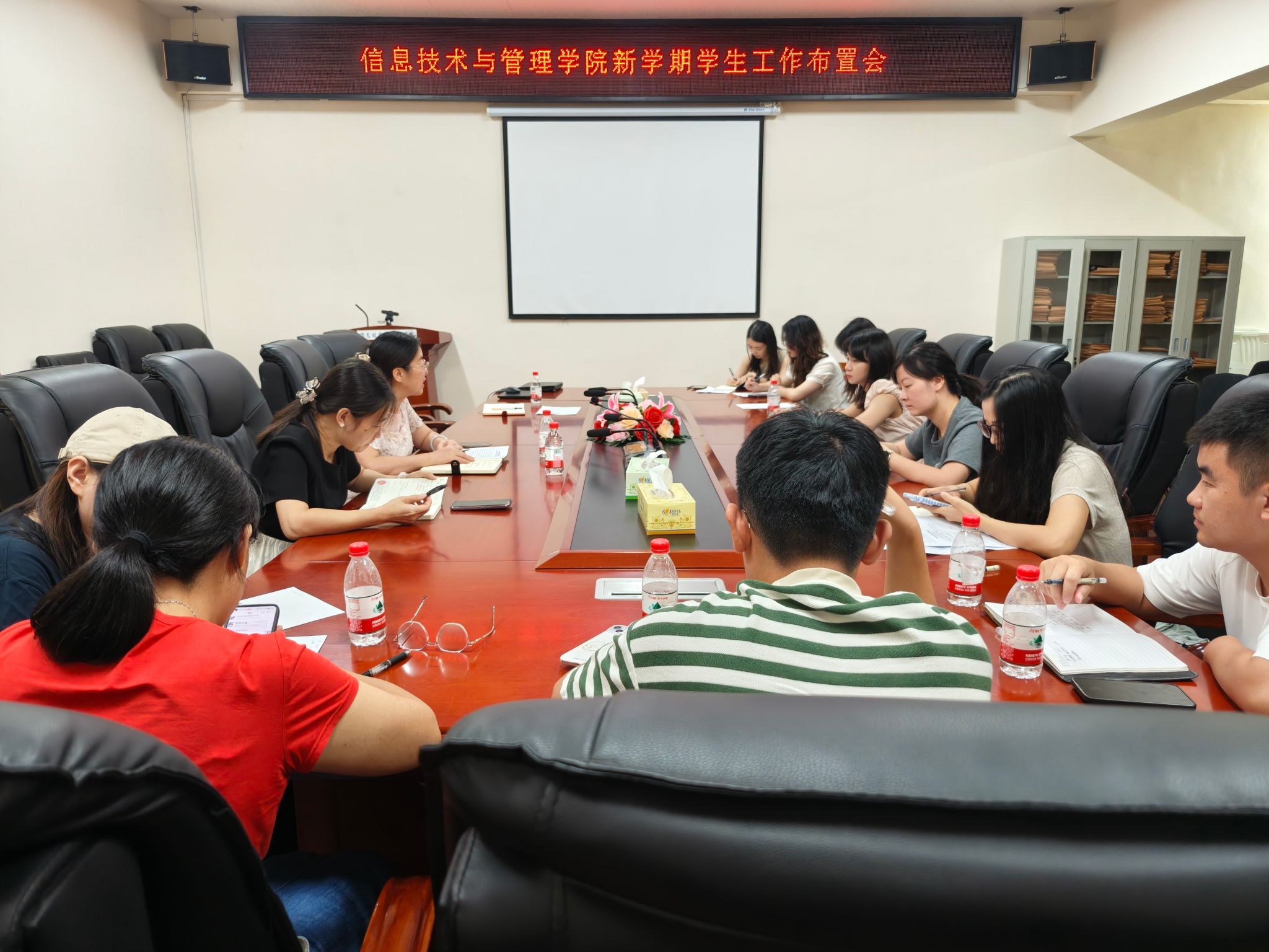 (本网讯)9 月 3 日,信息技术与管理学院在315会议室召开新学期学生工作布置会,全面部署本学期学生管理与育人重点任务。学院党委副书记唐雄伟出席会议并讲话,学工办副主任陈慧主持会议,全体专兼职辅导员参加会议。