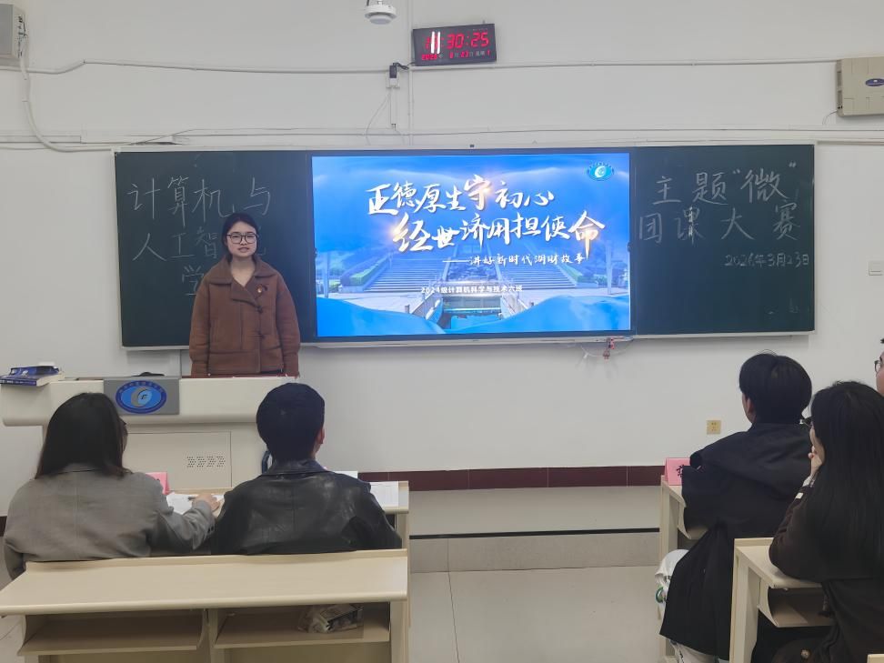 3月23日,计算机与人工智能学院于第二教学楼2104教室举办2026年“青春向党,智启未来”主题微团课竞赛。学院团总支书记李雨希及团学会主席团成员蒋磊、邓涛、赵雯婷担任评委,比赛由院团学会学生干部欧嗣铭主持。