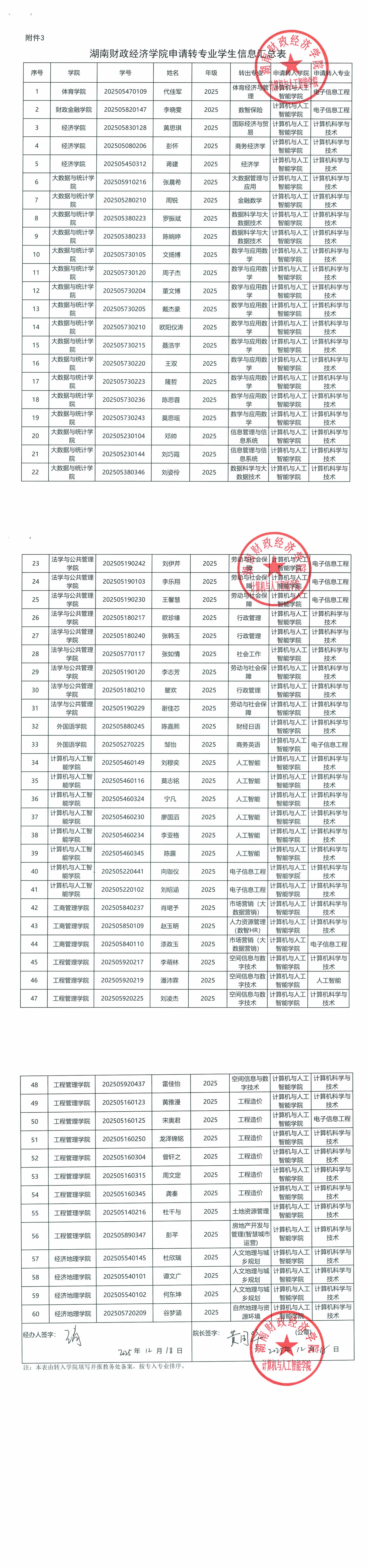 2025年计算机与人工智能学院转专业录取学生信息表