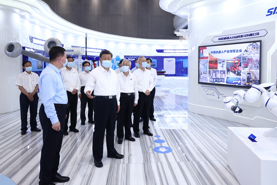 2022年8月16日至17日,中共中央总书记、国家主席、中央军委主席习近平在辽宁考察。这是17日下午,习近平在沈阳新松机器人自动化股份有限公司展厅,了解公司生产经营、自主创新情况。 新华社记者 鞠鹏/摄