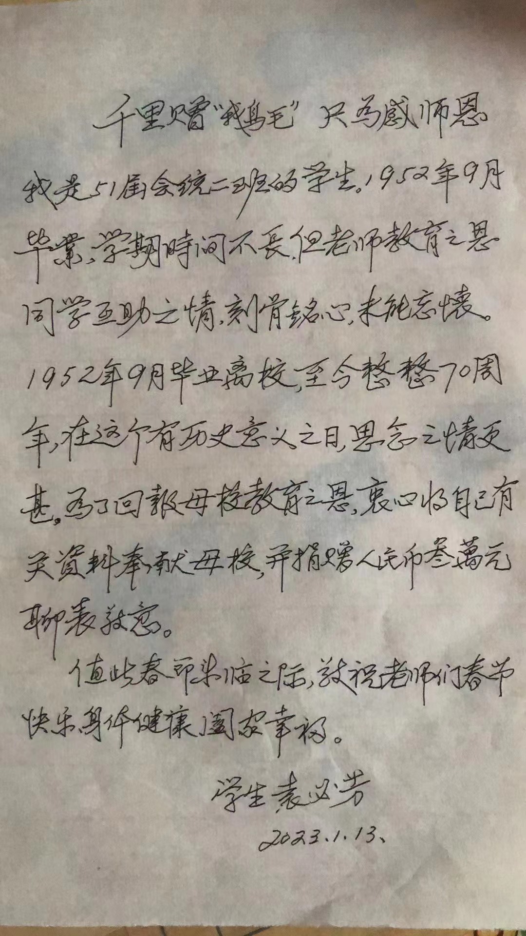 捐款前,袁老手写了一封情深意切的信给校长刘长庚,并随信附赠了他在母校求学时的一些资料以及他编著的书籍、字幅。袁老在信中表示,在这离校的70年中,每每思念母校当年恩、窗友情,历历在目,未能忘怀。几十年来,母校发生了翻天覆地的变化,他作为校友由衷感到高兴。
